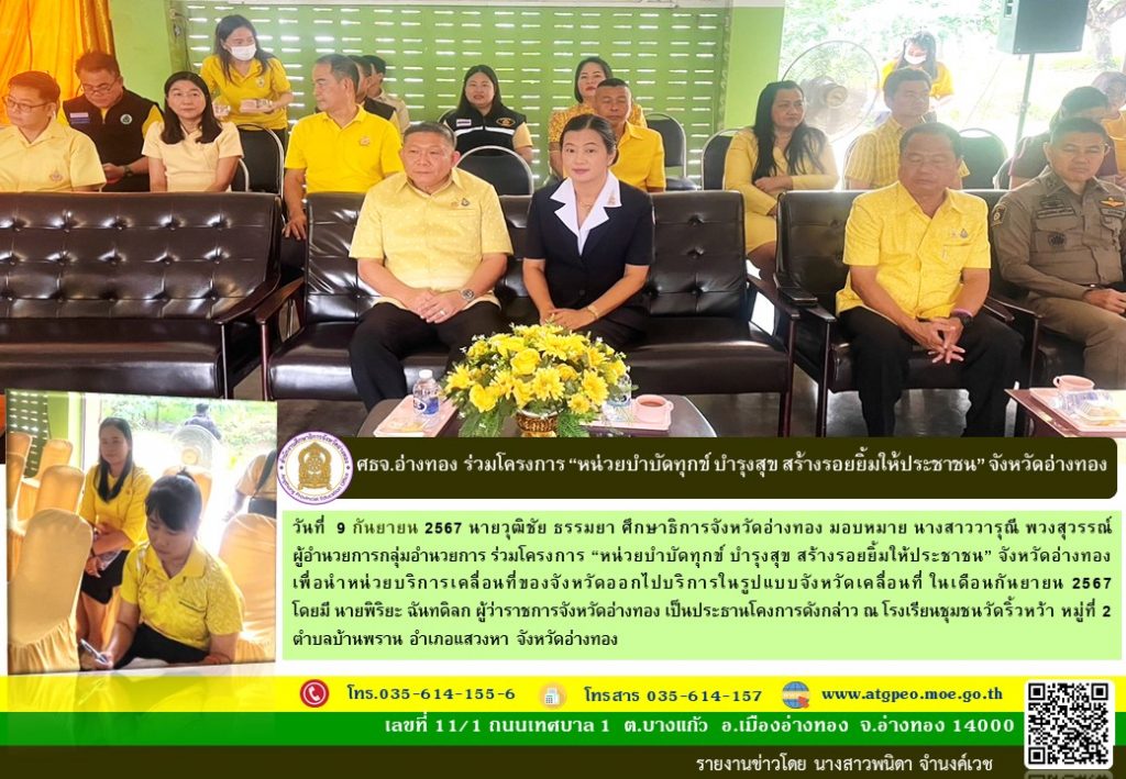 วันที่ 9 กันยายน 2567 นายวุฒิชัย ธรรมยา ศึกษาธิการจังหวัดอ่างทอง มอบหมาย นางสาววารุณี พวงสุวรรณ์ ผู้อำนวยการกลุ่มอำนวยการ ร่วมโครงการ “หน่วยบำบัดทุกข์ บำรุงสุข สร้างรอยยิ้มให้ประชาชน” จังหวัดอ่างทอง เพื่อนำหน่วยบริการเคลื่อนที่ของจังหวัดออกไปบริการในรูปแบบจังหวัดเคลื่อนที่ ในเดือนกันยายน 2567 โดยมี นายพิริยะ ฉันทดิลก ผู้ว่าราชการจังหวัดอ่างทอง เป็นประธานโคงการดังกล่าว ณ โรงเรียนชุมชนวัดริ้วหว้า หมู่ที่ 2 ตำบลบ้านพราน อำเภอแสวงหา จังหวัดอ่างทอง