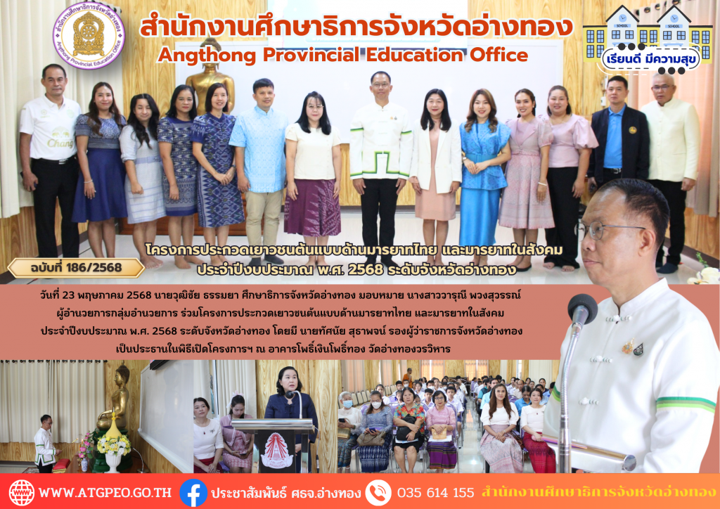 วันที่ 23 พฤษภาคม 2568 นายวุฒิชัย ธรรมยา ศึกษาธิการจังหวัดอ่างทอง มอบหมาย นางสาววารุณี พวงสุวรรณ์ ผู้อำนวยการกลุ่มอำนวยการ ร่วมโครงการประกวดเยาวชนต้นแบบด้านมารยาทไทย และมารยาทในสังคมประจำปีงบประมาณ พ.ศ. 2568 ระดับจังหวัดอ่างทอง โดยมี นายทัศนัย สุธาพจน์ รองผู้ว่าราชการจังหวัดอ่างทอง เป็นประธานในพิธีเปิดโครงการฯ ณ อาคารโพธิ์เงินโพธิ์ทอง วัดอ่างทองวรวิหาร