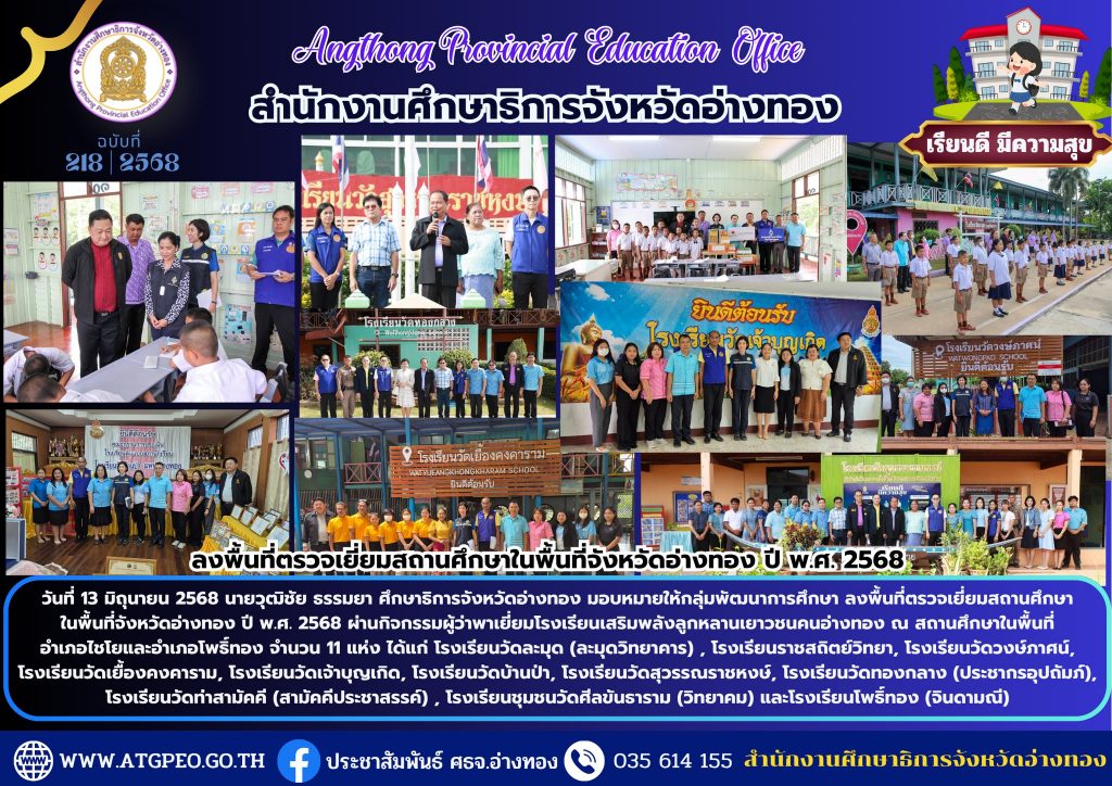 วันที่ 13 มิถุนายน 2568 นายวุฒิชัย ธรรมยา ศึกษาธิการจังหวัดอ่างทอง มอบหมายให้กลุ่มพัฒนาการศึกษา ลงพื้นที่ตรวจเยี่ยมสถานศึกษา ในพื้นที่จังหวัดอ่างทอง ปี พ.ศ. 2568 ผ่านกิจกรรมผู้ว่าพาเยี่ยมโรงเรียนเสริมพลังลูกหลานเยาวชนคนอ่างทอง ณ สถานศึกษาในพื้นที่ อำเภอไชโยและอำเภอโพธิ์ทอง จำนวน 11 แห่ง ได้แก่ โรงเรียนวัดละมุด (ละมุดวิทยาคาร) , โรงเรียนราชสถิตย์วิทยา, โรงเรียนวัดวงษ์ภาศน์, โรงเรียนวัดเยื้องคงคาราม, โรงเรียนวัดเจ้าบุญเกิด, โรงเรียนวัดบ้านป่า, โรงเรียนวัดสุวรรณราชหงษ์, โรงเรียนวัดทองกลาง (ประชากรอุปถัมภ์), โรงเรียนวัดท่าสามัคคี (สามัคคีประชาสรรค์) , โรงเรียนชุมชนวัดศีลขันธาราม (วิทยาคม) และโรงเรียนโพธิ์ทอง (จินดามณี)
