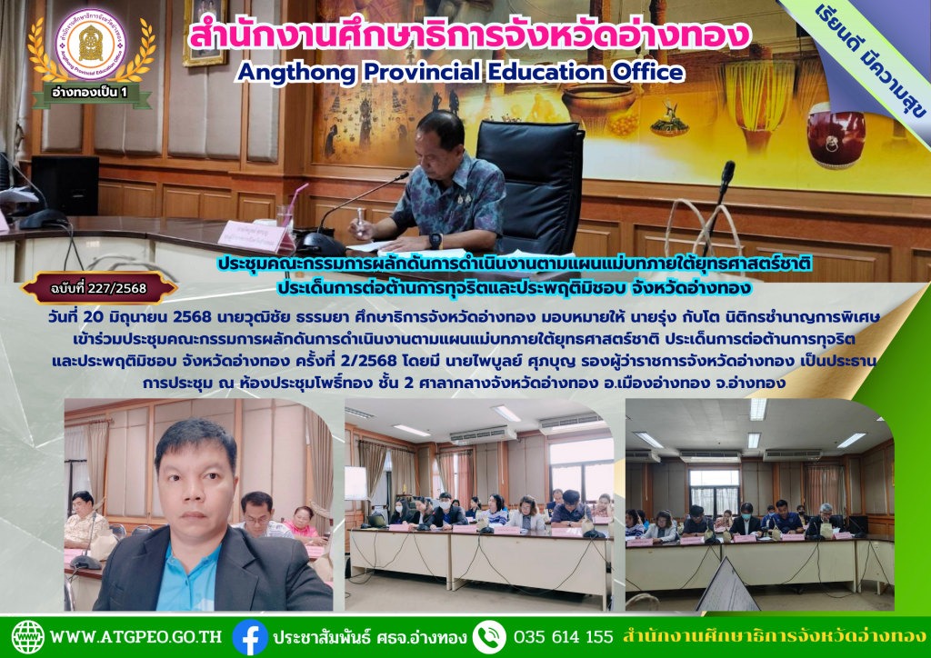 วันที่ 20 มิถุนายน 2568 นายวุฒิชัย ธรรมยา ศึกษาธิการจังหวัดอ่างทอง มอบหมายให้ นายรุ่ง กับโต นิติกรชำนาญการพิเศษ เข้าร่วมประชุมคณะกรรมการผลักดันการดำเนินงานตามแผนแม่บทภายใต้ยุทธศาสตร์ชาติ ประเด็นการต่อต้านการทุจริต และประพฤติมิชอบ จังหวัดอ่างทอง ครั้งที่ 2/2568 โดยมี นายไพบูลย์ ศุภบุญ รองผู้ว่าราชการจังหวัดอ่างทอง เป็นประธาน การประชุม ณ ห้องประชุมโพธิ์ทอง ชั้น 2 ศาลากลางจังหวัดอ่างทอง อ.เมืองอ่างทอง จ.อ่างทอง