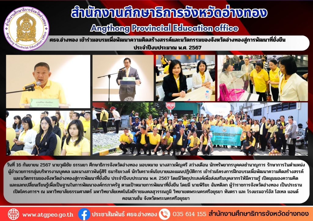 วันที่ 16 กันยายน 2567 นายวุฒิชัย ธรรมยา ศึกษาธิการจังหวัดอ่างทอง มอบหมาย นางสาวเพ็ญศรี สว่างเดือน นักทรัพยากรบุคคลชำนาญการ รักษาการในตำแหน่งผู้อำนวยการกลุ่มบริหารงานบุคคล และนางสาวพันธุ์ศิริ ธนาริยะวงศ์ นักวิเคราะห์นโยบายและแผนปฏิบัติการ เข้าร่วมโครงการฝึกอบรมเพื่อพัฒนาความคิดสร้างสรรค์และนวัตกรรมของจังหวัดอ่างทองสู่การพัฒนาที่ยั่งยืน ประจำปีงบประมาณ พ.ศ. 2567 โดยมีวัตถุประสงค์เพื่อส่งเสริมบุคลากรให้มีความรู้ เปิดมุมมองความคิดและแลกเปลี่ยนเรียนรู้เพื่อเป็นฐานในการพัฒนาองค์กรภาครัฐ ตามเป้าหมายการพัฒนาที่ยั่งยืน โดยมี นายพิริยะ ฉันทดิลก ผู้ว่าราชการจังหวัดอ่างทอง เป็นประธาน เปิดโครงการฯ ณ มหาวิทยาลัยธรรมศาสตร์ มหาวิทยาลัยเทคโนโลยีราชมงคลสุวรรณภูมิ วิทยาเขตพระนครศรีอยุธยา หันตรา และ โรงแรมอาร์อัส โฮเทล แอนด์ คอนเวนชั่น จังหวัดพระนครศรีอยุธย
