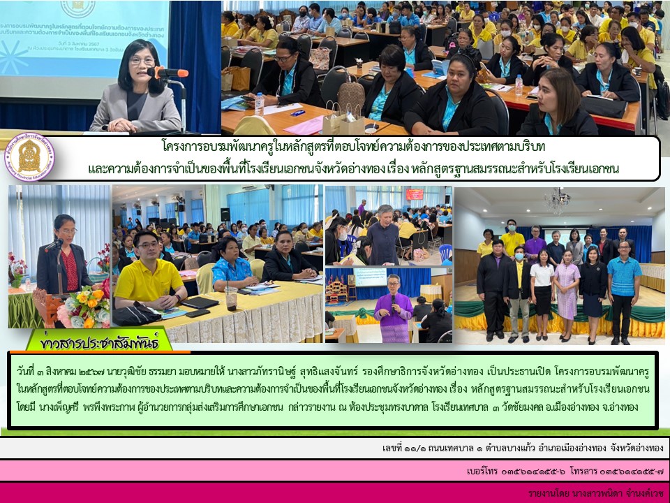 วันที่ 3 สิงหาคม 2567 นายวุฒิชัย ธรรมยา มอบหมายให้ นางสาวภัทรานิษฐ์ สุทธิแสงจันทร์ รองศึกษาธิการจังหวัดอ่างทอง เป็นประธานเปิดโครงการอบรมพัฒนาครูในหลักสูตรที่ตอบโจทย์ความต้องการของประเทศตามบริบทและความต้องการจำเป็นของพื้นที่โรงเรียนเอกชนจังหวัดอ่างทอง เรื่อง หลักสูตรฐานสมรรถนะสำหนับโรงเรียนเอกชน โดยมี นางเพ็ญศรี พนพึงพระกาฬ ผู้อำนวยการกลุ่มส่งเสริมการศึกษาเอกชน กล่าวรายงาน ณ ห้องประชุมทรงบาดาล โรงเรียนเทศบาล 3 วัดชัยมงคล อ.เมือง จ.อ่างทอง