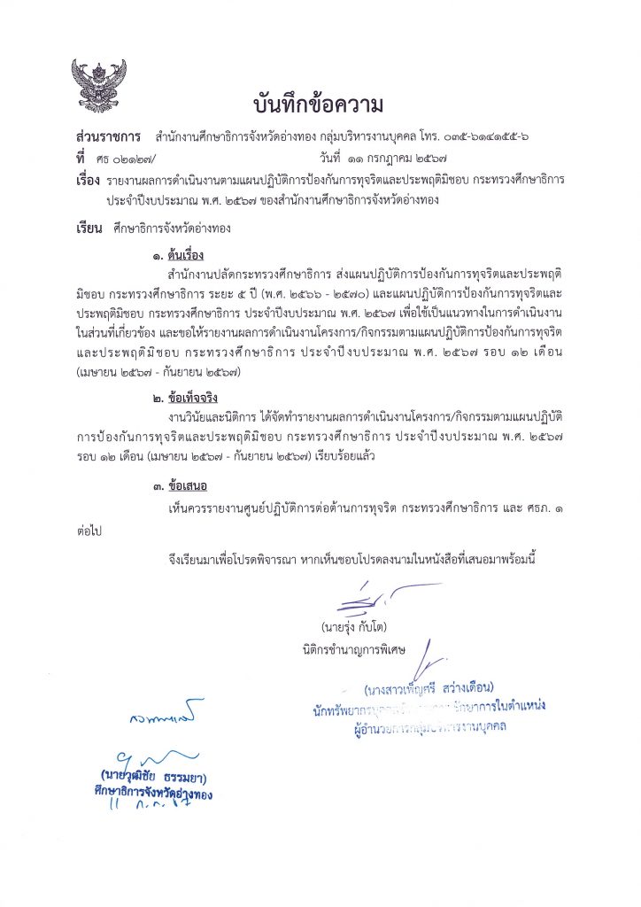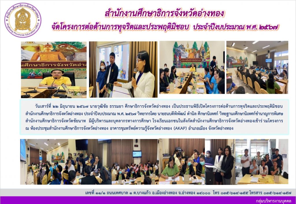 รายงานผลการดำเนินการป้องกันการทุจริตประจำปี 10 กรกฎาคม 256712 กรกฎาคม 2024 atg peo ITA 2567 รายงานผลการดำเนินงานตามแผนปฏิบัติการป้องกันการทุจริตและประพฤติมิชอบ กระทรวงศึกษาธิการ ประจำปีงบประมาณ พ.ศ.2567 ของสำนักงานศึกษาธิการจังหวัดอ่างทอง ภาพกิจกรรม (ที่สื่อถึงการดำเนินการสู่ความสำเร็จ) atg peo