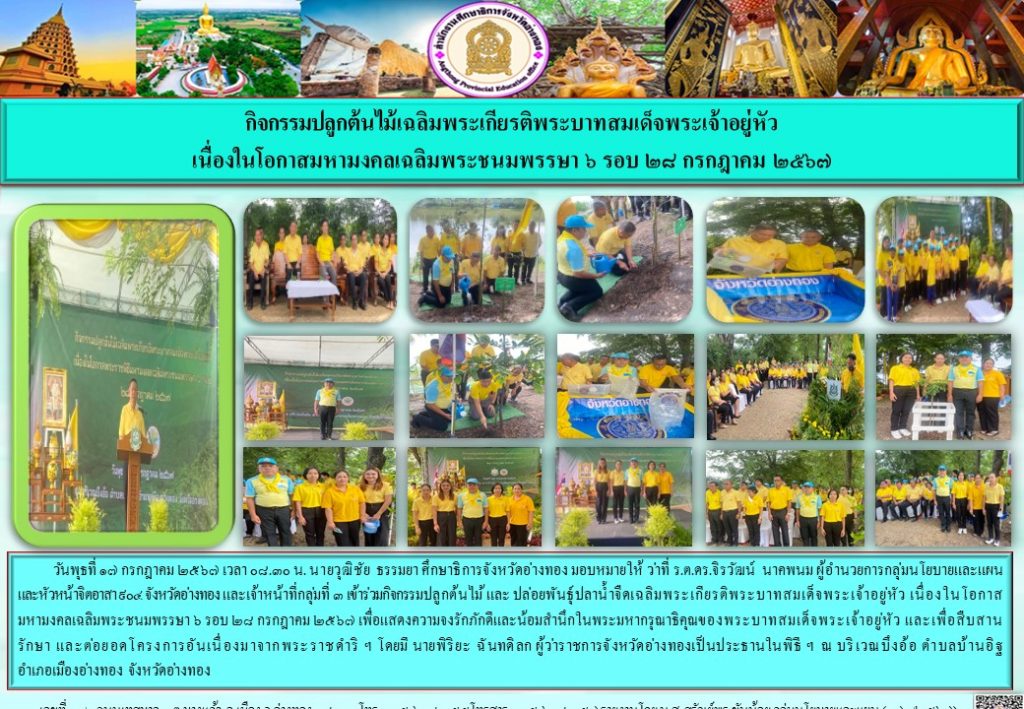 วันพุธที่ 17 กรกฎาคม 2567 เวลา 08.30 น. นายวุฒิชัย  ธรรมยา ศึกษาธิการจังหวัดอ่างทอง มอบหมายให้ ว่าที่ ร.ต.ดร.จิรวัฒน์  นาคพนม ผู้อำนวยการกลุ่มนโยบายและแผน และหัวหน้าจิตอาสา 904 จังหวัดอ่างทอง และเจ้าหน้าที่กลุ่มที่ 3 เข้าร่วมกิจกรรมปลูกต้นไม้ และ ปล่อยพันธุ์ปลาน้ำจืดเฉลิมพระเกียรติพระบาทสมเด็จพระเจ้าอยู่หัว เนื่องในโอกาสมหามงคลเฉลิมพระชนมพรรษา 6 รอบ 28 กรกฎาคม 2567 เพื่อแสดงความจงรักภักดีและน้อมสำนึกในพระมหากรุณาธิคุณของพระบาทสมเด็จพระเจ้าอยู่หัว และเพื่อสืบสาน รักษา และต่อยอดโครงการอันเนื่องมาจากพระราชดำริ ฯ โดยมี นายพิริยะ  ฉันทดิลก ผู้ว่าราชการจังหวัดอ่างทองเป็นประธานในพิธี ฯ  ณ บริเวณบึงอ้อ ตำบลบ้านอิฐ  อำเภอเมืองอ่างทอง จังหวัดอ่างทอง