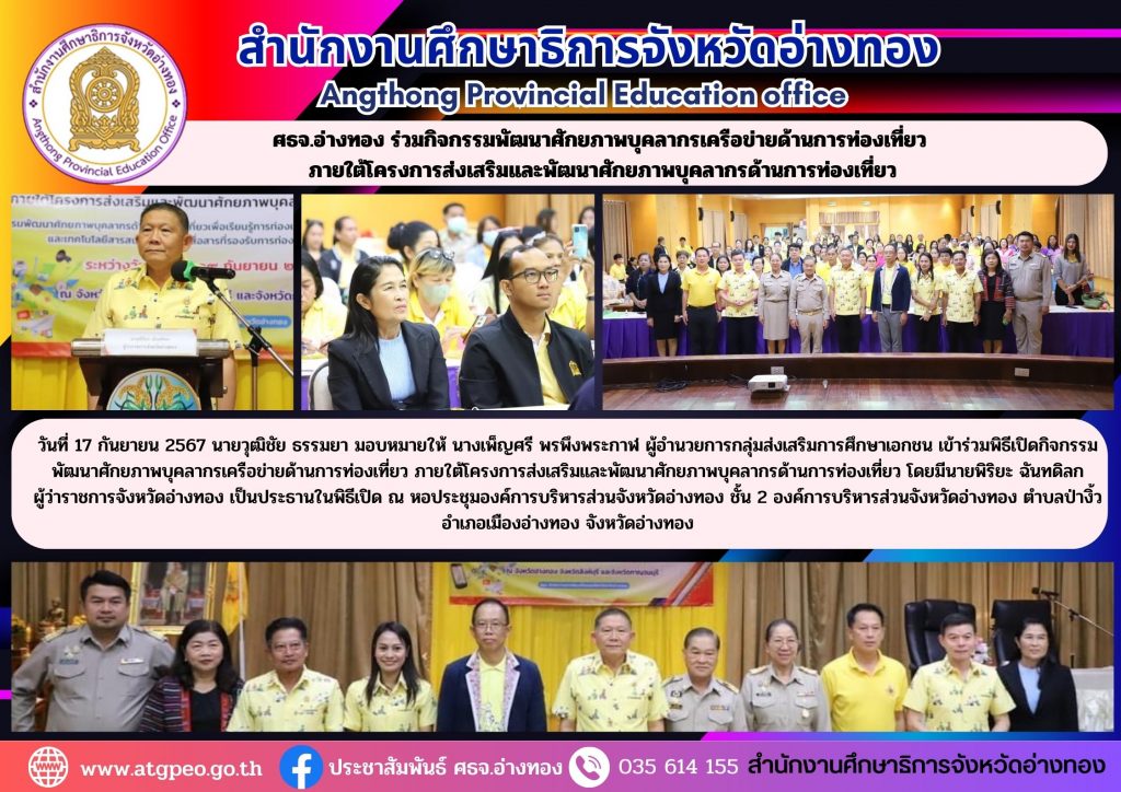 วันที่ 17 กันยายน 2567 นายวุฒิชัย ธรรมยา มอบหมายให้ นางเพ็ญศรี พรพึงพระกาฬ ผู้อำนวยการกลุ่มส่งเสริมการศึกษาเอกชน เข้าร่วมพิธีเปิดกิจกรรมพัฒนาศักยภาพบุคลากรเครือข่ายด้านการท่องเที่ยว ภายใต้โครงการส่งเสริมและพัฒนาศักยภาพบุคลากรด้านการท่องเที่ยว โดยมีนายพิริยะ ฉันทดิลก ผู้ว่าราชการจังหวัดอ่างทอง เป็นประธานในพิธีเปิด ณ หอประชุมองค์การบริหารส่วนจังหวัดอ่างทอง ชั้น 2 องค์การบริหารส่วนจังหวัดอ่างทอง ตำบลป่างิ้ว อำเภอเมืองอ่างทอง จังหวัดอ่างทอง