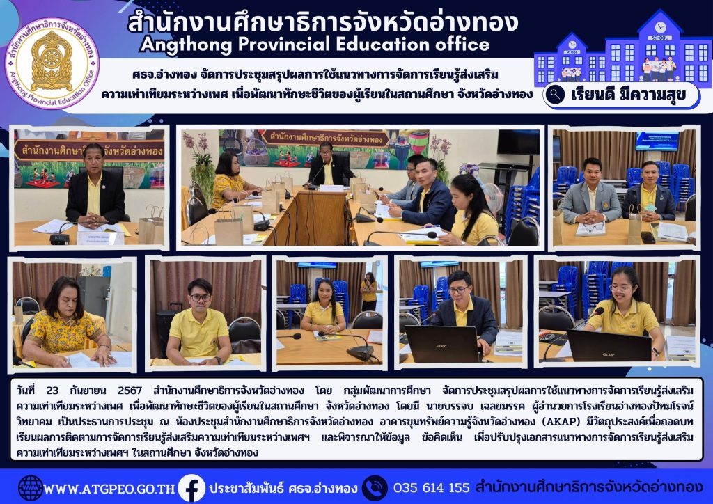 วันที่ 23 กันยายน 2567 สำนักงานศึกษาธิการจังหวัดอ่างทอง โดย กลุ่มพัฒนาการศึกษา จัดการประชุมสรุปผลการใช้แนวทางการจัดการเรียนรู้ส่งเสริมความเท่าเทียมระหว่างเพศ เพื่อพัฒนาทักษะชีวิตของผู้เรียนในสถานศึกษา จังหวัดอ่างทอง โดยมี นายบรรจบ เฉลยมรรค ผู้อำนวยการโรงเรียนอ่างทองปัทมโรจน์วิทยาคม เป็นประธานการประชุม ณ ห้องประชุมสำนักงานศึกษาธิการจังหวัดอ่างทอง อาคารขุมทรัพย์ความรู้จังหวัดอ่างทอง (AKAP) มีวัตถุประสงค์เพื่อถอดบทเรียนผลการติดตามการจัดการเรียนรู้ส่งเสริมความเท่าเทียมระหว่างเพศฯ และพิจารณาให้ข้อมูล ข้อคิดเห็น เพื่อปรับปรุงเอกสารแนวทางการจัดการเรียนรู้ส่งเสริมความเท่าเทียมระหว่างเพศฯ ในสถานศึกษา จังหวัดอ่างทอง