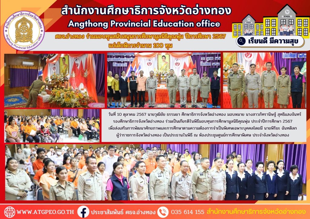 วันที่ 10 ตุลาคม 2567 นายวุฒิชัย ธรรมยา ศึกษาธิการจังหวัดอ่างทอง มอบหมาย นางสาวภัทรานิษฐ์ สุทธิแสงจันทร์ รองศึกษาธิการจังหวัดอ่างทอง ร่วมเป็นเกียรติในพิธีมอบทุนการศึกษามูลนิธิคุณพุ่ม ประจำปีการศึกษา 2567 เพื่อส่งเสริมการพัฒนาศักยภาพและการศึกษาตามความต้องการจำเป็นพิเศษเฉพาะบุคคลโดยมี นายพิริยะ ฉันทดิลก ผู้ว่าราชการจังหวัดอ่างทอง เป็นประธานในพิธี ณ ห้องประชุมศูนย์การศึกษาพิเศษ ประจำจังหวัดอ่างทอง