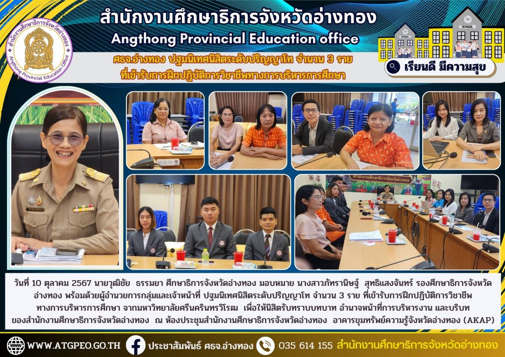 วันที่ 10 ตุลาคม 2567 นายวุฒิชัย ธรรมยา ศึกษาธิการจังหวัดอ่างทอง มอบหมาย นางสาวภัทรานิษฐ์ สุทธิแสงจันทร์ รองศึกษาธิการจังหวัดอ่างทอง พร้อมด้วยผู้อำนวยการกลุ่มและเจ้าหน้าที่ ปฐมนิเทศนิสิตระดับปริญญาโท จำนวน 3 ราย ที่เข้ารับการฝึกปฏิบัติการวิชาชีพ ทางการบริหารการศึกษา จากมหาวิทยาลัยศรีนครินทรวิโรฒ เพื่อให้นิสิตรับทราบบทบาท อำนาจหน้าที่การบริหารงาน และบริบท ของสำนักงานศึกษาธิการจังหวัดอ่างทอง ณ ห้องประชุมสำนักงานศึกษาธิการจังหวัดอ่างทอง อาคารขุมทรัพย์ความรู้จังหวัดอ่างทอง (AKAP)