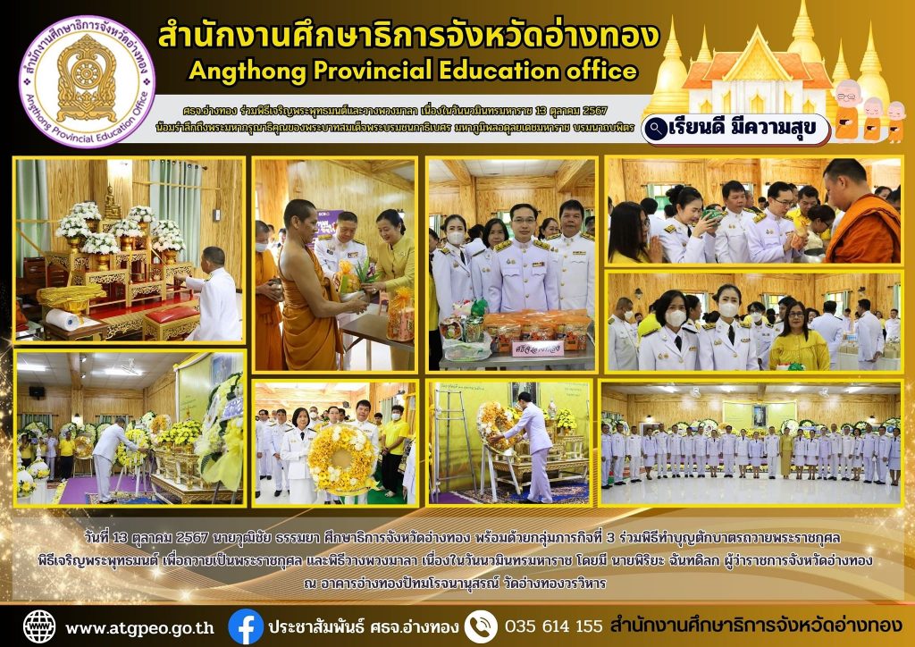 วันที่ 13 ตุลาคม 2567 นายวุฒิชัย ธรรมยา ศึกษาธิการจังหวัดอ่างทอง พร้อมด้วยกลุ่มภารกิจที่ 3 ร่วมพิธีทำบุญตักบาตรถวายพระราชกุศล พิธีเจริญพระพุทธมนต์ เพื่อถวายเป็นพระราชกุศล และพิธีวางพวงมาลา เนื่องในวันนวมินทรมหาราช โดยมี นายพิริยะ ฉันทดิลก ผู้ว่าราชการจังหวัดอ่างทอง ณ อาคารอ่างทองปัทมโรจนานุสรณ์ วัดอ่างทองวรวิหาร