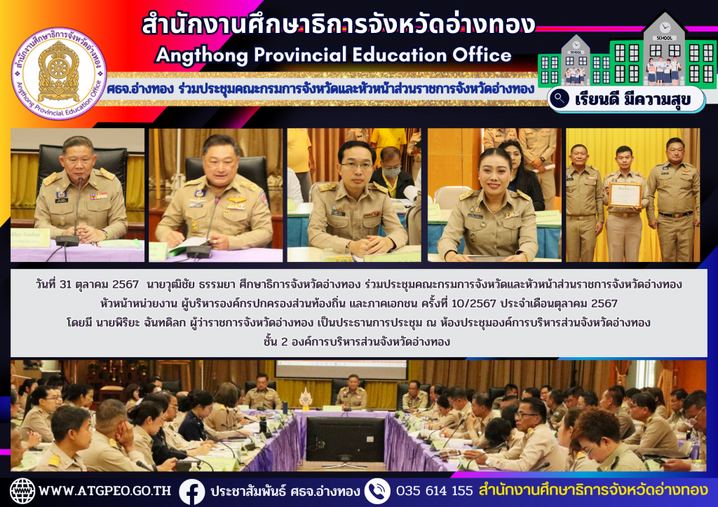 วันที่ 31 ตุลาคม 2567 นายวุฒิชัย ธรรมยา ศึกษาธิการจังหวัดอ่างทอง ร่วมประชุมคณะกรมการจังหวัดและหัวหน้าส่วนราชการจังหวัดอ่างทอง หัวหน้าหน่วยงาน ผู้บริหารองค์กรปกครองส่วนท้องถิ่น และภาคเอกชน ครั้งที่ 10/2567 ประจำเดือนตุลาคม 2567 โดยมี นายพิริยะ ฉันทดิลก ผู้ว่าราชการจังหวัดอ่างทอง เป็นประธานการประชุม ณ ห้องประชุมองค์การบริหารส่วนจังหวัดอ่างทอง ชั้น 2 องค์การบริหารส่วนจังหวัดอ่างทอง