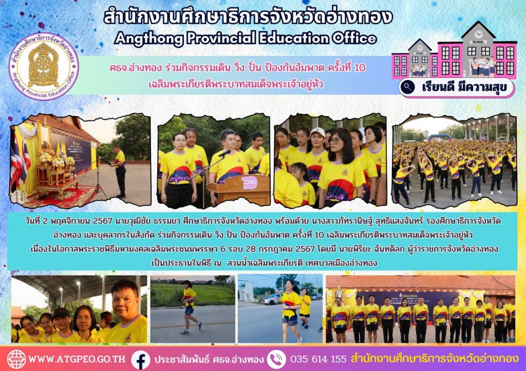 วันที่ 2 พฤศจิกายน 2567 นายวุฒิชัย ธรรมยา ศึกษาธิการจังหวัดอ่างทอง พร้อมด้วย นางสาวภัทรานิษฐ์ สุทธิแสงจันทร์ รองศึกษาธิการจังหวัดอ่างทอง และบุคลากรในสังกัด ร่วมกิจกรรมเดิน วิ่ง ปั่น ป้องกันอัมพาต ครั้งที่ 10 เฉลิมพระเกียรติพระบาทสมเด็จพระเจ้าอยู่หัว เนื่องในโอกาสพระราชพิธีมหามงคลเฉลิมพระชนมพรรษา 6 รอบ 28 กรกฎาคม 2567 โดยมี นายพิริยะ ฉันทดิลก ผู้ว่าราชการจังหวัดอ่างทอง เป็นประธานในพิธี ณ สวนน้ำเฉลิมพระเกียรติ เทศบาลเมืองอ่างทอง