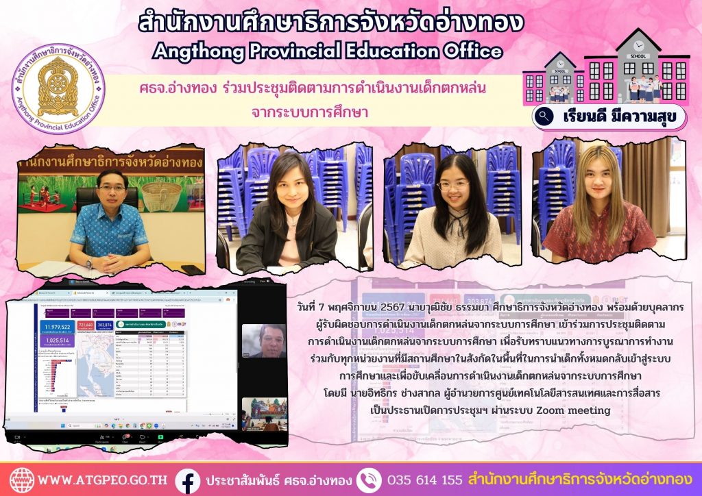 วันที่ 7 พฤศจิกายน 2567 นายวุฒิชัย ธรรมยา ศึกษาธิการจังหวัดอ่างทอง พร้อมด้วยบุคลากรผู้รับผิดชอบการดำเนินงานเด็กตกหล่นจากระบบการศึกษา เข้าร่วมการประชุมติดตาม การดำเนินงานเด็กตกหล่นจากระบบการศึกษา เพื่อรับทราบแนวทางการบูรณาการทำงาน ร่วมกับทุกหน่วยงานที่มีสถานศึกษาในสังกัดในพื้นที่ในการนำเด็กทั้งหมดกลับเข้าสู่ระบบ การศึกษาและเพื่อขับเคลื่อนการดำเนินงานเด็กตกหล่นจากระบบการศึกษา โดยมี นายอิทธิกร ช่างสากล ผู้อำนวยการศูนย์เทคโนโลยีสารสนเทศและการสื่อสารเป็นประธานเปิดการประชุมฯ ผ่านระบบ Zoom meeting