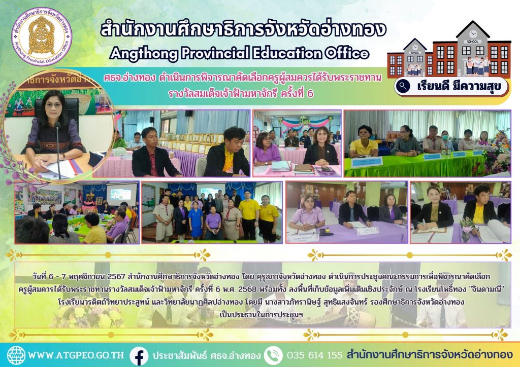 วันที่ 6 – 7 พฤศจิกายน 2567 สำนักงานศึกษาธิการจังหวัดอ่างทอง โดย คุรุสภาจังหวัดอ่างทอง ดำเนินการประชุมคณะกรรมการเพื่อพิจารณาคัดเลือก ครูผู้สมควรได้รับพระราชทานรางวัลสมเด็จเจ้าฟ้ามหาจักรี ครั้งที่ 6 พ.ศ. 2568 พร้อมทั้ง ลงพื้นที่เก็บข้อมูลเพิ่มเติมเชิงประจักษ์ ณ โรงเรียนโพธิ์ทอง “จินดามณี” โรงเรียนวรดิตถ์วิทยาประสูทน์ และวิทยาลัยนาฏศิลปอ่างทอง โดยมี นางสาวภัทรานิษฐ์ สุทธิแสงจันทร์ รองศึกษาธิการจังหวัดอ่างทองเป็นประธานในการประชุมฯ