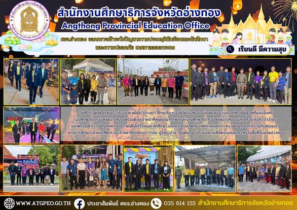 วันที่ 15 พฤศจิกายน 2567 นายวุฒิชัย ธรรมยา ศึกษาธิการจังหวัดอ่างทอง มอบหมาย นางสาวภัทรานิษฐ์ สุทธิแสงจันทร์ รองศึกษาธิการจังหวัดอ่างทอง พร้อมด้วยเจ้าหน้าที่ศูนย์เสมารักษ์สำนักงานศึกษาธิการจังหวัดอ่างทอง และเครือข่ายประจำอำเภอ ออกตรวจเฝ้าระวังปัญหาความประพฤตินักเรียนและนักศึกษา และความปลอดภัย เทศกาลลอยกระทง โดยบูรณาการร่วมกับหน่วยงานทางการศึกษา เจ้าหน้าที่ตำรวจ เจ้าหน้าที่ปกครอง กำนัน ผู้ใหญ่บ้าน เป็นต้น ณ บริเวณสถานที่จัดงานลอยกระทงในพื้นที่จังหวัดอ่างทอง