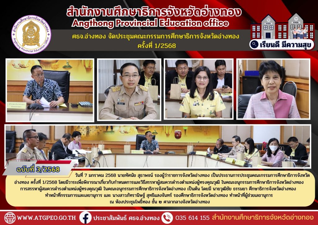 วันที่ 7 มกราคม 2568 นายทัศนัย สุธาพจน์ รองผู้ว่าราชการจังหวัดอ่างทอง เป็นประธานการประชุมคณะกรรมการศึกษาธิการจังหวัดอ่างทอง ครั้งที่ 1/2568 โดยมีวาระเพื่อพิจารณาเกี่ยวกับกำหนดการและวิธีสรรหาผู้สมควรดำรงตำแหน่งผู้ทรงคุณวุฒิ ในคณะอนุกรรมการศึกษาธิการจังหวัดอ่างทอง การสรรหาผู้สมควรดำรงตำแหน่งผู้ทรงคุณวุฒิ ในคณะอนุกรรมการศึกษาธิการจังหวัดอ่างทอง เป็นต้น โดยมี นายวุฒิชัย ธรรมยา ศึกษาธิการจังหวัดอ่างทอง ทำหน้าที่กรรมการและเลขานุการ และ นางสาวภัทรานิษฐ์ สุทธิแสงจันทร์ รองศึกษาธิการจังหวัดอ่างทอง ทำหน้าที่ผู้ช่วยเลขานุการ ณ ห้องประชุมโพธิ์ทอง ชั้น ๒ ศาลากลางจังหวัดอ่างทอง