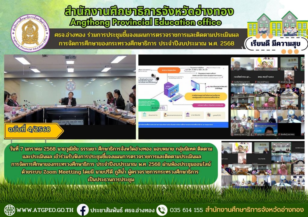 วันที่ 7 มกราคม 2568 นายวุฒิชัย ธรรมยา ศึกษาธิการจังหวัดอ่างทอง มอบหมาย กลุ่มนิเทศ ติดตาม และประเมินผล เข้าร่วมรับฟังการประชุมชี้แจงแผนการตรวจราชการและติดตามประเมินผลการจัดการศึกษาของกระทรวงศึกษาธิการ ประจำปีงบประมาณ พ.ศ. 2568 ผ่านห้องประชุมออนไลน์ด้วยระบบ Zoom Meetting โดยมี นายปรีดี ภูสีน้ำ ผู้ตรวจราชการกระทรวงศึกษาธิการ เป็นประธานการประชุม