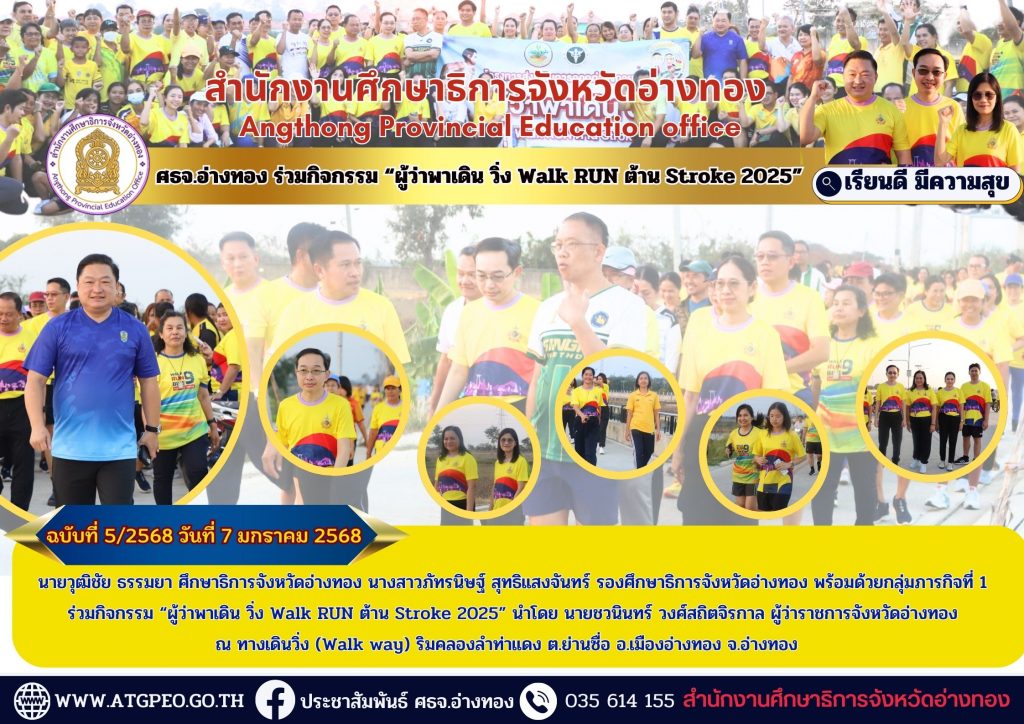 นายวุฒิชัย ธรรมยา ศึกษาธิการจังหวัดอ่างทอง นางสาวภัทรนิษฐ์ สุทธิแสงจันทร์ รองศึกษาธิการจังหวัดอ่างทอง พร้อมด้วยกลุ่มภารกิจที่ 1 ร่วมกิจกรรม “ผู้ว่าพาเดิน วิ่ง Walk RUN ต้าน Stroke 2025” นำโดย นายชวนินทร์ วงศ์สถิตจิรกาล ผู้ว่าราชการจังหวัดอ่างทอง ณ ทางเดินวิ่ง (Walk way) ริมคลองลำท่าแดง ต.ย่านซื่อ อ.เมืองอ่างทอง จ.อ่างทอง