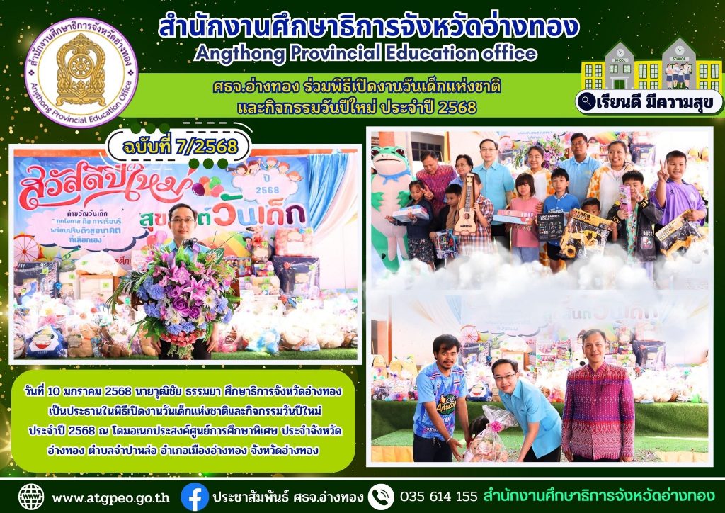 วันที่ 10 ธันวาคม 2568 นายวุฒิชัย ธรรมยา ศึกษาธิการจังหวัดอ่างทอง มอบหมาย นางสาวภัทรานิษฐ์ สุทธิแสงจันทร์ รองศึกษาธิการจังหวัดอ่างทอง เข้าร่วมเป็นเกียรติ ในพิธีเปิด “โครงการ อบจ.พม.ร่วมใจในวันคนพิการสากล จังหวัดอ่างทอง” โดยมี นายชวนินทร์ วงศ์สถิตจิรกาล ผู้ว่าราชการจังหวัดอ่างทอง เป็นประธานในพิธี ณ อาคารสำนึกรักบ้านเกิด องค์การบริหารส่วนจังหวัดอ่างทอง