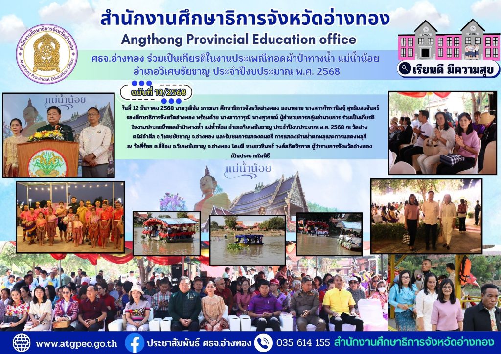 วันที่ 12 ธันวาคม 2568 นายวุฒิชัย ธรรมยา ศึกษาธิการจังหวัดอ่างทอง มอบหมาย นางสาวภัทรานิษฐ์ สุทธิแสงจันทร์ รองศึกษาธิการจังหวัดอ่างทอง พร้อมด้วย นางสาววารุณี พวงสุวรรณ์ ผู้อำนวยการกลุ่มอำนวยการ ร่วมเป็นเกียรติ ในงานประเพณีทอดผ้าป่าทางน้ำ แม่น้ำน้อย อำเภอวิเศษชัยชาญ ประจำปีงบประมาณ พ.ศ. 2568 ณ วัดฝาง