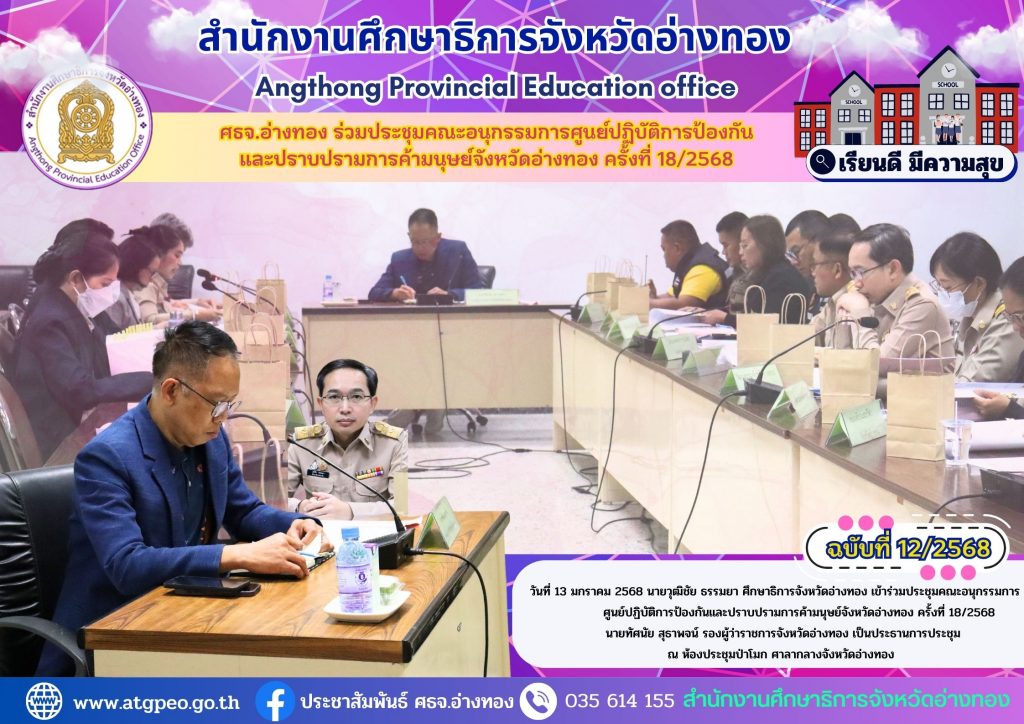 วันที่ 13 มกราคม 2568 นายวุฒิชัย ธรรมยา ศึกษาธิการจังหวัดอ่างทอง เข้าร่วมประชุมคณะอนุกรรมการ ศูนย์ปฏิบัติการป้องกันและปราบปรามการค้ามนุษย์จังหวัดอ่างทอง ครั้งที่ 1/2568 โดยมี นายทัศนัย สุธาพจน์ รองผู้ว่าราชการจังหวัดอ่างทอง เป็นประธานการประชุม ณ ห้องประชุมป่าโมก ชั้น 2 ศาลากลางจังหวัดอ่างทอง