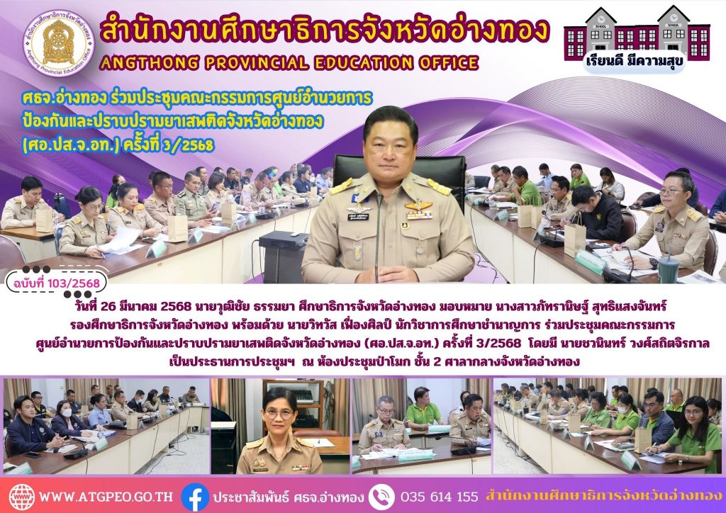 วันที่ 26 มีนาคม 2568 นายวุฒิชัย ธรรมยา ศึกษาธิการจังหวัดอ่างทอง มอบหมาย นางสาวภัทรานิษฐ์ สุทธิแสงจันทร์ รองศึกษาธิการจังหวัดอ่างทอง พร้อมด้วย นายวิทวัส เฟื่องศิลป์ นักวิชาการศึกษาชำนาญการ ร่วมประชุมคณะกรรมการศูนย์อำนวยการป้องกันและปราบปรามยาเสพติดจังหวัดอ่างทอง (ศอ.ปส.จ.อท.) ครั้งที่ 3/2568 โดยมี นายชวนินทร์ วงศ์สถิตจิรกาล เป็นประธานการประชุมฯ ณ ห้องประชุมป่าโมก ชั้น 2 ศาลากลางจังหวัดอ่างทอง