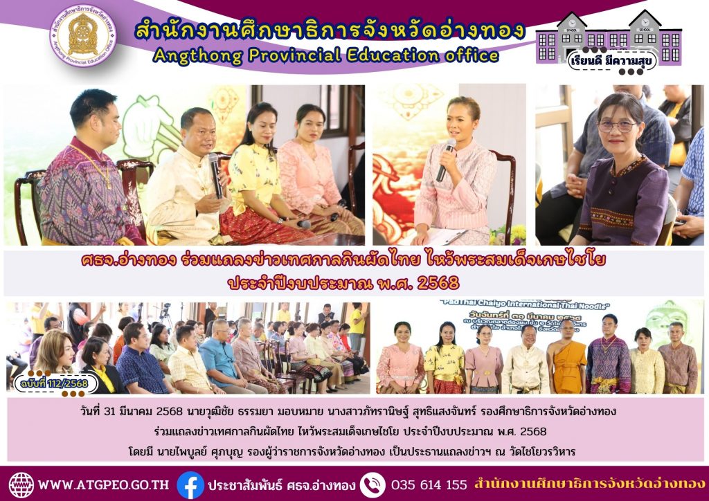 วันที่ 31 มีนาคม 2568 นายวุฒิชัย ธรรมยา มอบหมาย นางสาวภัทรานิษฐ์ สุทธิแสงจันทร์ รองศึกษาธิการจังหวัดอ่างทอง ร่วมแถลงข่าวเทศกาลกินผัดไทย ไหว้พระสมเด็จเกษไชโย ประจำปีงบประมาณ พ.ศ. 2568 โดยมี นายไพบูลย์ ศุภบุญ รองผู้ว่าราชการจังหวัดอ่างทอง เป็นประธานแถลงข่าวฯ ณ วัดไชโยวรวิหาร