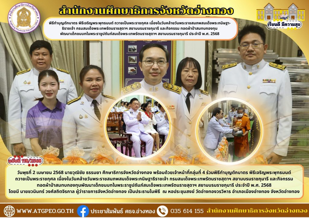 วันพุธที่ 2 เมษายน 2568 นายวุฒิชัย ธรรมยา ศึกษาธิการจังหวัดอ่างทอง พร้อมด้วยเจ้าหน้าที่กลุ่มที่ 4 ร่วมพิธีทำบุญตักบาตร พิธีเจริญพระพุทธมนต์ ถวายเป็นพระราชกุศล เนื่องในวันคล้ายวันพระราชสมภพสมเด็จพระกนิษฐาธิราชเจ้า กรมสมเด็จพระเทพรัตนราชสุดาฯ สยามบรมราชกุมารี และ กิจกรรมทอดผ้าป่าสมทบกองทุนพัฒนาเด็กชนบทในพระราชูปถัมภ์สมเด็จพระเทพรัตนราชสุดาฯ สยามบรมราชกุมารี ประจำปี พ.ศ. ๒๕๖๘ โดยมี นายชวนินทร์ วงศ์สถิตจิรกาล ผู้ว่าราชการจังหวัดอ่างทอง เป็นประธานในพิธี ณ หอประชุมสงฆ์ วัดอ่างทองวรวิหาร อำเภอเมืองอ่างทอง จังหวัดอ่างทอง2