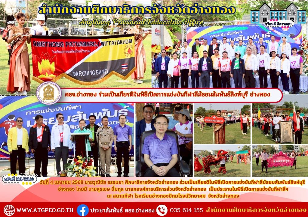 วันที่ 4 เมษายน 2568 นายวุฒิชัย ธรรมยา ศึกษาธิการจังหวัดอ่างทอง ร่วมเป็นเกียรติในพิธีเปิดการแข่งขันกีฬาสีมัธยมสัมพันธ์สิงห์บุรี อ่างทอง โดยมี นายสุรเชษ นิ่มกุล นายกองค์การบริหารส่วนจังหวัดอ่างทอง เป็นประธานในพิธีเปิดการแข่งขันกีฬาสีฯ ณ สนามกีฬา โรงเรียนอ่างทองปัทมโรจน์วิทยาคม จังหวัดอ่างทอง