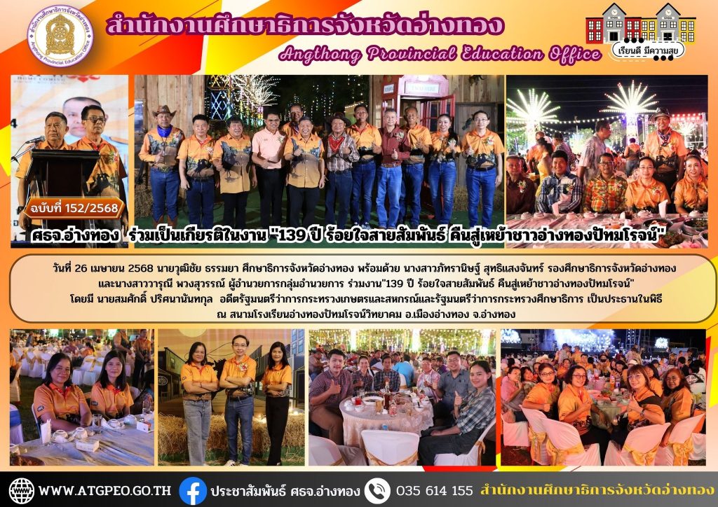 วันที่ 26 เมษายน 2568 นายวุฒิชัย ธรรมยา ศึกษาธิการจังหวัดอ่างทอง พร้อมด้วย นางสาวภัทรานิษฐ์ สุทธิแสงจันทร์ รองศึกษาธิการจังหวัดอ่างทอง และนางสาววารุณี พวงสุวรรณ์ ผู้อำนวยการกลุ่มอำนวยการ ร่วมงาน”139 ปี ร้อยใจสายสัมพันธ์ คืนสู่เหย้าชาวอ่างทองปัทมโรจน์” โดยมี นายสมศักดิ์ ปริศนานันทกุล อดีตรัฐมนตรีว่าการกระทรวงเกษตรและสหกรณ์และรัฐมนตรีว่าการกระทรวงศึกษาธิการ เป็นประธานในพิธี ณ สนามโรงเรียนอ่างทองปัทมโรจน์วิทยาคม อ.เมืองอ่างทอง จ.อ่างทอง