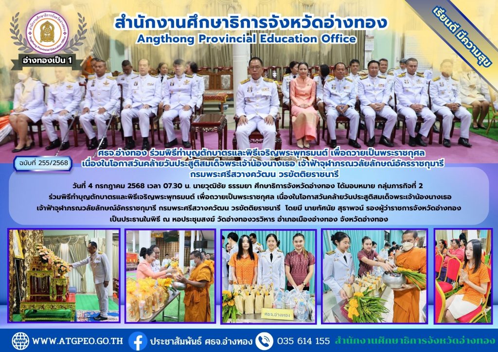 วันที่ 4 กรกฎาคม 2568 เวลา 07.30 น. นายวุฒิชัย ธรรมยา ศึกษาธิการจังหวัดอ่างทอง ได้มอบหมาย กลุ่มภารกิจที่ 2 ร่วมพิธีทำบุญตักบาตรและพิธีเจริญพระพุทธมนต์ เพื่อถวายเป็นพระราชกุศล เนื่องในโอกาสวันคล้ายวันประสูติสมเด็จพระเจ้าน้องนางเธอ เจ้าฟ้าจุฬาภรณวลัยลักษณ์อัครราชกุมารี กรมพระศรีสวางควัฒน วรขัตติยราชนารี โดยมี นายทัศนัย สุธาพจน์ รองผู้ว่าราชการจังหวัดอ่างทอง เป็นประธานในพิธี ณ หอประชุมสงฆ์ วัดอ่างทองวรวิหาร อำเภอเมืองอ่างทอง จังหวัดอ่างทอง