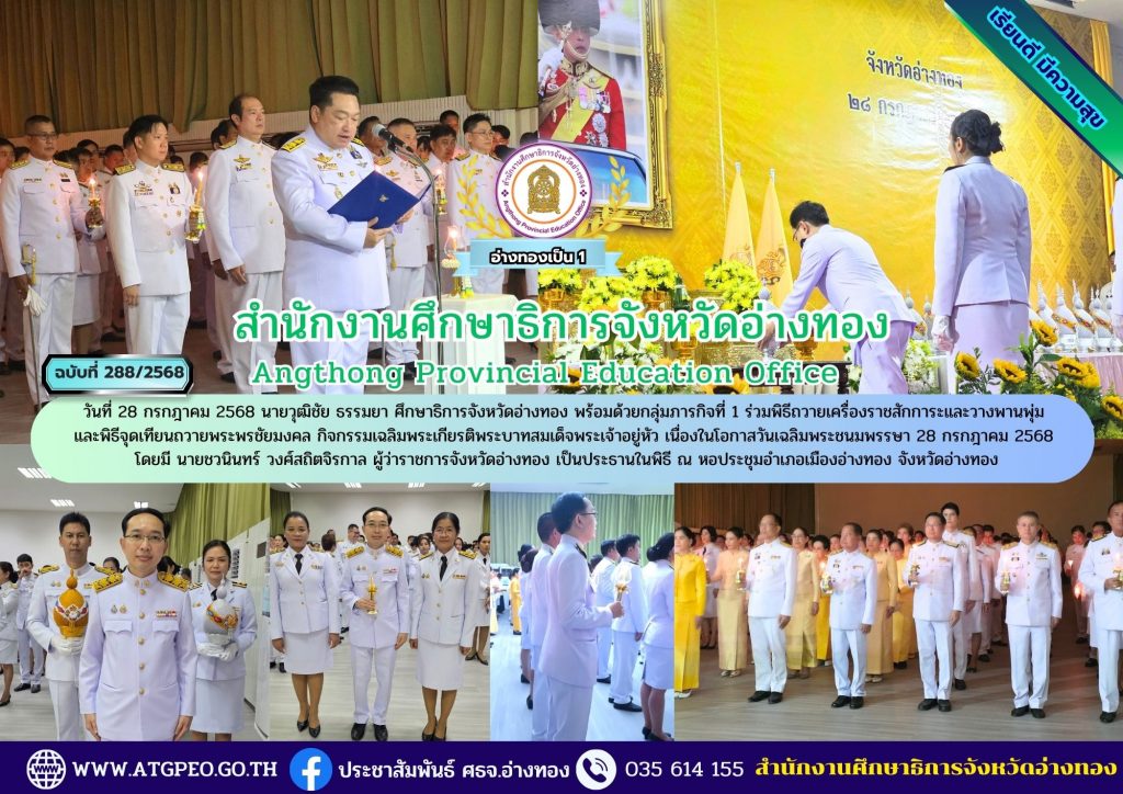 วันที่ 28 กรกฎาคม 2568 นายวุฒิชัย ธรรมยา ศึกษาธิการจังหวัดอ่างทอง พร้อมด้วยกลุ่มภารกิจที่ 1 ร่วมพิธีถวายเครื่องราชสักการะและวางพานพุ่มและพิธีจุดเทียนถวายพระพรชัยมงคล กิจกรรมเฉลิมพระเกียรติพระบาทสมเด็จพระเจ้าอยู่หัว เนื่องในโอกาสวันเฉลิมพระชนมพรรษา 28 กรกฎาคม 2568 โดยมี นายชวนินทร์ วงศ์สถิตจิรกาล ผู้ว่าราชการจังหวัดอ่างทอง เป็นประธานในพิธี ณ หอประชุมอำเภอเมืองอ่างทอง จังหวัดอ่างทอง