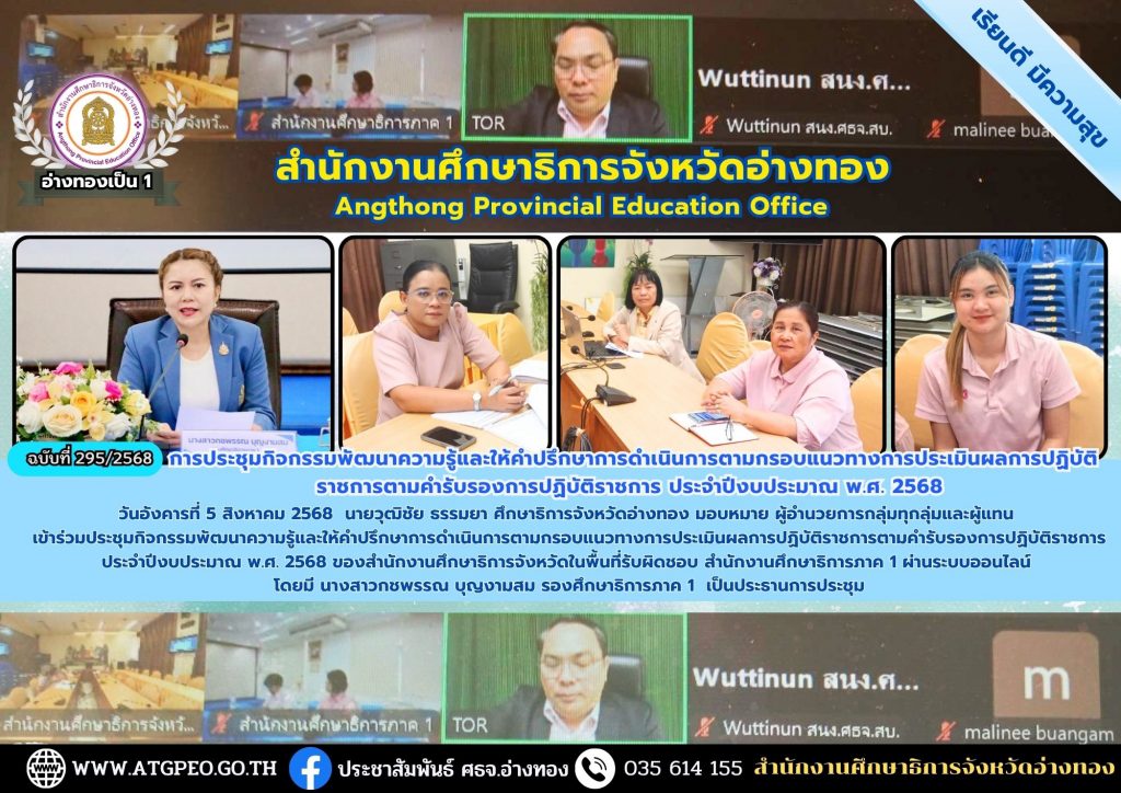 วันอังคารที่ 5 สิงหาคม 2568 นายวุฒิชัย ธรรมยา ศึกษาธิการจังหวัดอ่างทอง มอบหมาย ผู้อำนวยการกลุ่มทุกลุ่มและผู้แทน เข้าร่วมประชุมกิจกรรมพัฒนาความรู้และให้คำปรึกษาการดำเนินการตามกรอบแนวทางการประเมินผลการปฏิบัติราชการตามคำรับรองการปฏิบัติราชการ ประจำปีงบประมาณ พ.ศ. 2568 ของสำนักงานศึกษาธิการจังหวัดในพื้นที่รับผิดชอบ สำนักงานศึกษาธิการภาค 1 ผ่านระบบออนไลน์ โดยมี นางสาวกชพรรณ บุญงามสม รองศึกษาธิการภาค 1 เป็นประธานการประชุม