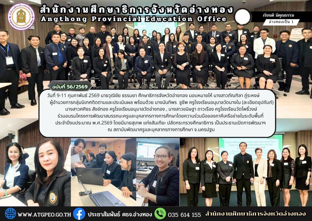 วันที่ 9-11 กุมภาพันธ์ 2569 นายวุฒิชัย ธรรมยา ศึกษาธิการจังหวัดอ่างทอง มอบหมายให้ นางสาวภัณฑิลา ภู่ระหงษ์ ผู้อำนวยการกลุ่มนิเทศติดตามและประเมินผล พร้อมด้วย นางนันทิพร ชูชีพ ครูโรงเรียนอนุบาลวัดนางใน (ละเอียดอุปถัมภ์) นางสาวศศิธร สังข์ทอง ครูโรงเรียนอนุบาลวัดอ่างทอง , นางสาวขนิษฐา ดาวเรือง ครูโรงเรียนวัดโพธิ์วงษ์ ร่วมอบรมโครงการพัฒนาสมรรถนะครูและบุคลากรทางการศึกษาโดยความร่วมมือของภาคีเครือข่ายในระดับพื้นที่ ประจำปีงบประมาณ พ.ศ.2569 โดยมีนายสุเทพ แก่งสันเทียะ ปลัดกระทรวงศึกษาธิการ เป็นประธานเปิดการพัฒนาฯ ณ สถาบันพัฒนาครูและบุคลากรทางการศึกษา จ.นครปฐม