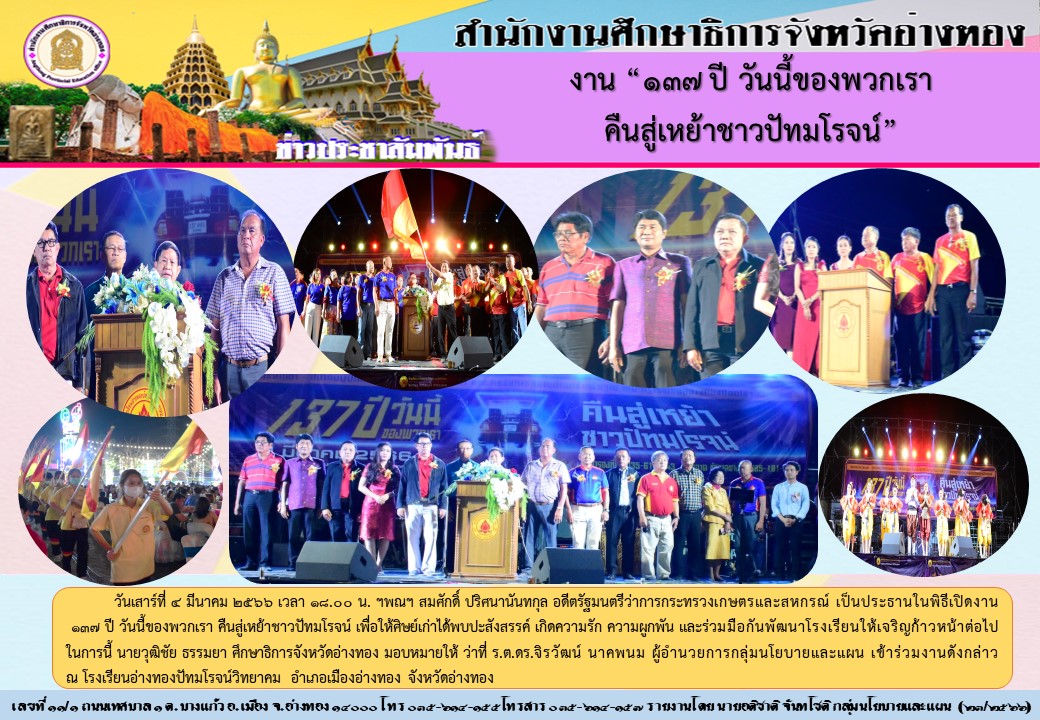 ศธจ.อ่างทอง ร่วมงาน 137 ปีวันนี้ของพวกเรา คืนสู่เหย้าชาวปัทมโรจน์ 4 มีนาคม 256616 มีนาคม 2023 พนิดา จำนงค์เวช ภาพกิจกรรม ศธจ.อ่างทอง FacebookFacebookXXLINELine พนิดา จำนงค์เวช