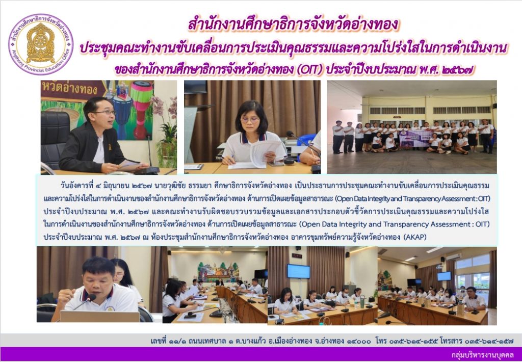 - รายงานการประชุมคณะทำงานขับเคลื่อนการประเมินคุณธรรมและความโปร่งใสในการดำเนินงานของสำนักงานศึกษาธิการจังหวัดอ่างทอง