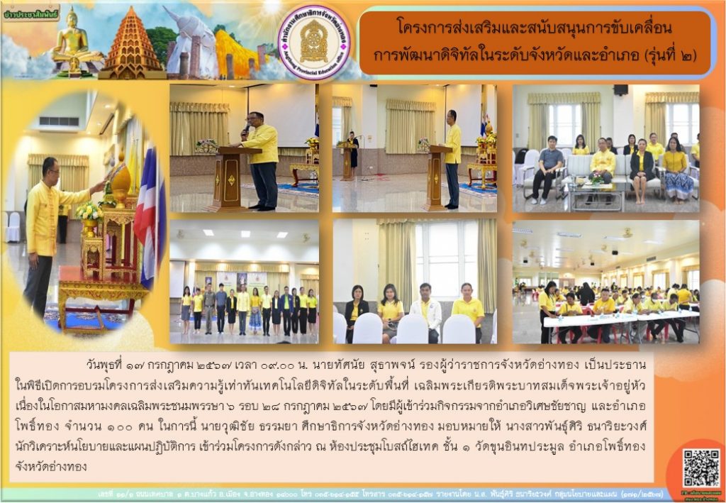 วันพุธที่ 17 กรกฎาคม 2567 เวลา 09.00 น. นายทัศนัย สุธาพจน์ รองผู้ว่าราชการจังหวัดอ่างทอง เป็นประธาน ในพิธีเปิดการอบรมโครงการส่งเสริมความรู้เท่าทันเทคโนโลยีดิจิทัลในระดับพื้นที่ เฉลิมพระเกียรติพระบาทสมเด็จพระเจ้าอยู่หัว เนื่องในโอกาสมหามงคลเฉลิมพระชนมพรรษา 6 รอบ 28 กรกฎาคม 2567 โดยมีผู้เข้าร่วมกิจกรรมจากอำเภอวิเศษชัยชาญ และอำเภอ โพธิ์ทอง จำนวน 100 คน ในการนี้ นายวุฒิชัย ธรรมยา ศึกษาธิการจังหวัดอ่างทอง มอบหมายให้ นางสาวพันธุ์ศิริ ธนาริยะวงศ์ นักวิเคราะห์นโยบายและแผนปฏิบัติการ เข้าร่วมโครงการดังกล่าว ณ ห้องประชุมโบสถ์ไฮเทค ชั้น 1 วัดขุนอินทประมูล อำเภอโพธิ์ทอง จังหวัดอ่างทอง