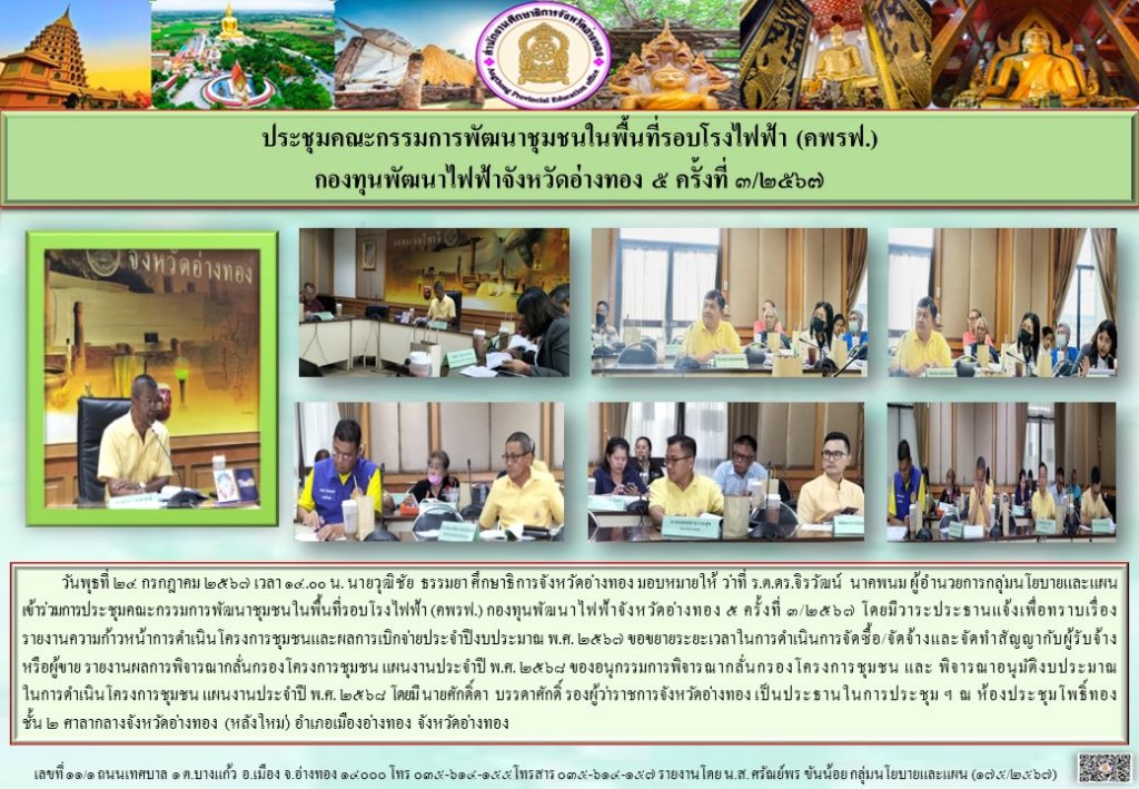 วันพุธที่ 24 กรกฎาคม 2567 เวลา 14.00 น. นายวุฒิชัย ธรรมยา ศึกษาธิการจังหวัดอ่างทอง มอบหมายให้ ว่าที่ ร.ต.ดร.จิรวัฒน์ นาคพนม ผู้อำนวยการกลุ่มนโยบายและแผน เข้าร่วมการประชุมคณะกรรมการพัฒนาชุมชนในพื้นที่รอบโรงไฟฟ้า (คพรฟ.) กองทุนพัฒนาไฟฟ้าจังหวัดอ่างทอง 5 ครั้งที่ 3/2567 โดยมีวาระประธานแจ้งเพื่อทราบเรื่อง รายงานความก้าวหน้าการดำเนินโครงการชุมชนและผลการเบิกจ่ายประจำปีงบประมาณ พ.ศ. 2567 ขอขยายระยะเวลาในการดำเนินการจัดซื้อ/จัดจ้างและจัดทำสัญญากับผู้รับจ้างหรือผู้ขาย รายงานผลการพิจารณากลั่นกรองโครงการชุมชน แผนงานประจำปี พ.ศ. 2568 ของอนุกรรมการพิจารณากลั่นกรองโครงการชุมชน และ พิจารณาอนุมัติงบประมาณในการดำเนินโครงการชุมชน แผนงานประจำปี พ.ศ. 2568 โดยมี นายศักดิ์ดา บรรดาศักดิ์ รองผู้ว่าราชการจังหวัดอ่างทอง เป็นประธานในการประชุม ฯ ณ ห้องประชุมโพธิ์ทอง ชั้น 2 ศาลากลางจังหวัดอ่างทอง (หลังใหม่) อำเภอเมืองอ่างทอง จังหวัดอ่างทอง