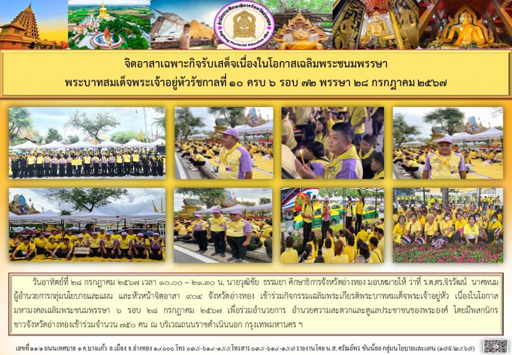 วันอาทิตย์ที่ 28 กรกฎาคม 2567 เวลา 10.00 – 21.30 น. นายวุฒิชัย ธรรมยา ศึกษาธิการจังหวัดอ่างทอง มอบหมายให้ ว่าที่ ร.ต.ดร.จิรวัฒน์ นาคพนมผู้อำนวยการกลุ่มนโยบายและแผน และหัวหน้าจิตอาสา 904 จังหวัดอ่างทอง เข้าร่วมกิจกรรมเฉลิมพระเกียรติพระบาทสมเด็จพระเจ้าอยู่หัว เนื่องในโอกาส