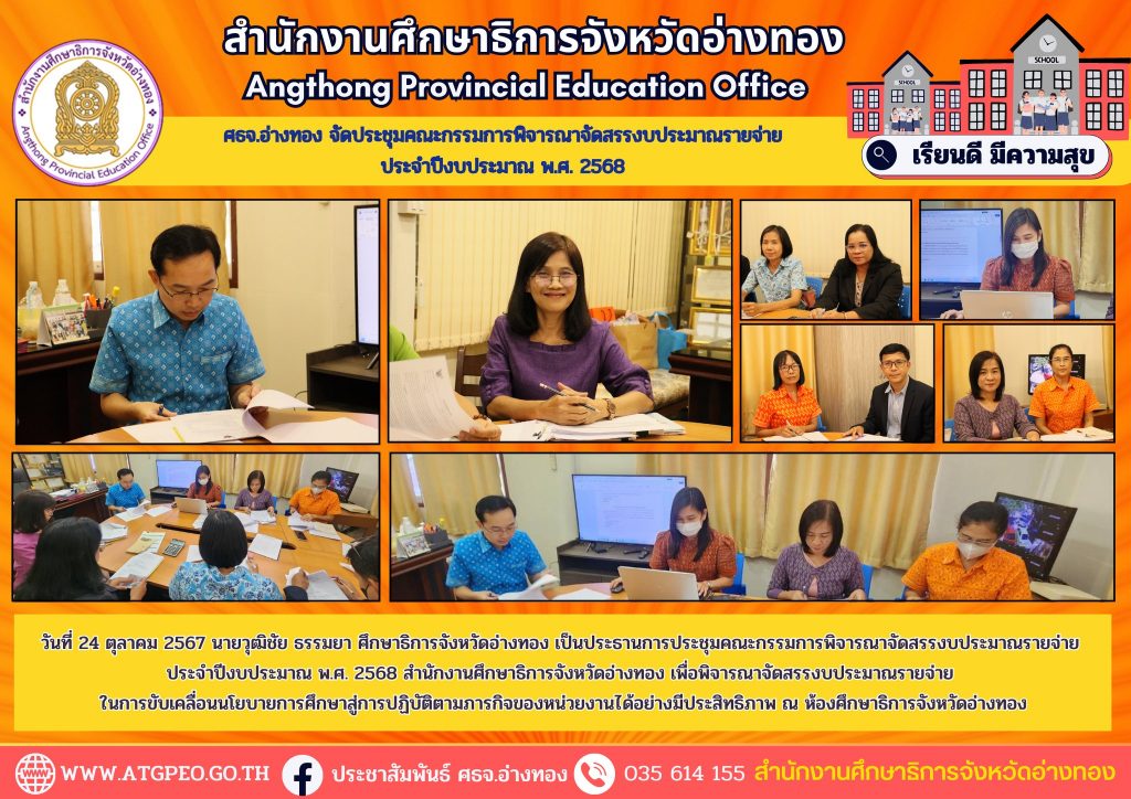วันที่ 24 ตุลาคม 2567 นายวุฒิชัย ธรรมยา ศึกษาธิการจังหวัดอ่างทอง เป็นประธานการประชุมคณะกรรมการพิจารณาจัดสรรงบประมาณรายจ่าย ประจำปีงบประมาณ พ.ศ. 2568 สำนักงานศึกษาธิการจังหวัดอ่างทอง เพื่อพิจารณาจัดสรรงบประมาณรายจ่าย ในการขับเคลื่อนนโยบายการศึกษาสู่การปฏิบัติตามภารกิจของหน่วยงานได้อย่างมีประสิทธิภาพ ณ ห้องศึกษาธิการจังหวัดอ่างทอง