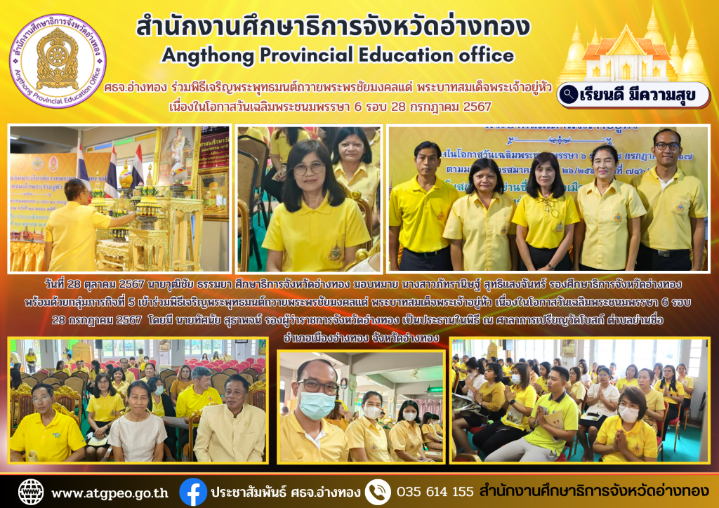 วันที่ 28 ตุลาคม 2567 นายวุฒิชัย ธรรมยา ศึกษาธิการจังหวัดอ่างทอง มอบหมาย นางสาวภัทรานิษฐ์ สุทธิแสงจันทร์ รองศึกษาธิการจังหวัดอ่างทอง พร้อมด้วยกลุ่มภารกิจที่ 5 เข้าร่วมพิธีเจริญพระพุทธมนต์ถวายพระพรชัยมงคลแด่ พระบาทสมเด็จพระเจ้าอยู่หัว เนื่องในโอกาสวันเฉลิมพระชนมพรรษา 6 รอบ 28 กรกฎาคม 2567 โดยมี นายทัศนัย สุธาพจน์ รองผู้ว่าราชการจังหวัดอ่างทอง เป็นประธานในพิธี ณ ศาลาการเปรียญวัดโบสถ์ ตำบลย่านซื่อ อำเภอเมืองอ่างทอง จังหวัดอ่างทอง