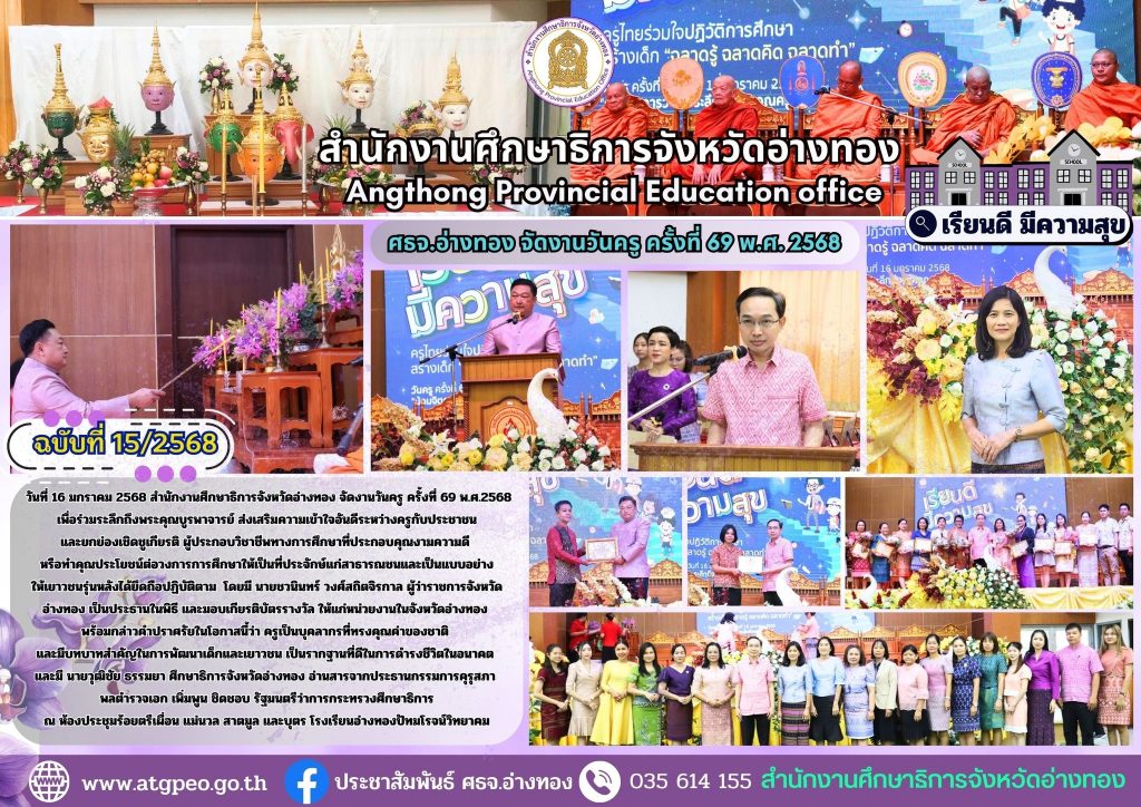 วันที่ 16 มกราคม 2568 สำนักงานศึกษาธิการจังหวัดอ่างทอง จัดงานวันครู ครั้งที่ 69 พ.ศ.2568 เพื่อร่วมระลึกถึงพระคุณบูรพาจารย์ ส่งเสริมความเข้าใจอันดีระหว่างครูกับประชาชน และยกย่องเชิดชูเกียรติ ผู้ประกอบวิชาชีพทางการศึกษาที่ประกอบคุณงามความดี หรือทำคุณประโยชน์ต่อวงการการศึกษาให้เป็นที่ประจักษ์แก่สาธารณชนและเป็นแบบอย่างให้เยาวชนรุ่นหลังได้ยึดถือปฏิบัติตาม โดยมี นายชวนินทร์ วงศ์สถิตจิรกาลผู้ว่าราชการจังหวัดอ่างทอง เป็นประธานในพิธี และมอบเกียรติบัตรรางวัล ให้แก่หน่วยงานในจังหวัดอ่างทอง พร้อมกล่าวคำปราศรัยในโอกาสนี้ว่า ครูเป็นบุคลากรที่ทรงคุณค่าของชาติ และมีบทบาทสำคัญในการพัฒนาเด็กและเยาวชน เป็นรากฐานที่ดีในการดำรงชีวิตในอนาคต และมี นายวุฒิชัย ธรรมยา ศึกษาธิการจังหวัดอ่างทอง อ่านสารจากประธานกรรมการคุรุสภา พลตำรวจเอก เพิ่มพูน ชิดชอบ รัฐมนตรีว่าการกระทรวงศึกษาธิการ ณ ห้องประชุมร้อยตรีเผื่อน แม่นวล สาตมูล และบุตร โรงเรียนอ่างทองปัทมโรจน์วิทยาคม