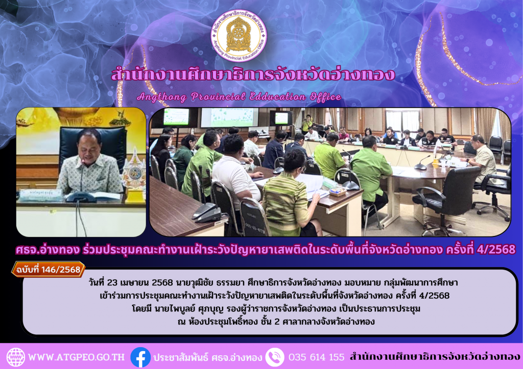 วันที่ 23 เมษายน 2568 นายวุฒิชัย ธรรมยา ศึกษาธิการจังหวัดอ่างทอง มอบหมาย กลุ่มพัฒนาการศึกษา เข้าร่วมการประชุมคณะทำงานเฝ้าระวังปัญหายาเสพติดในระดับพื้นที่จังหวัดอ่างทอง ครั้งที่ 4/2568 โดยมี นายไพบูลย์ ศุภบุญ รองผู้ว่าราชการจังหวัดอ่างทอง เป็นประธานการประชุม ณ ห้องประชุมโพธิ์ทอง ชั้น 2 ศาลากลางจังหวัดอ่างทอง