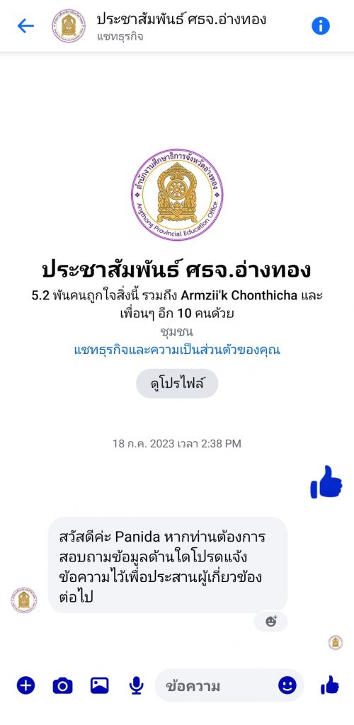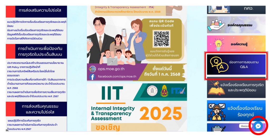 • สามารถสอบถามได้บนหน้าเว็บไซต์ของสำนักงานศึกษาธิการจังหวัดอ่างทอง ผ่านทางไอคอน (Messenger Live Chat ) หรือแบรนด์เนอร์ช่องทางการสอบถาม Q&A (สามารถคลิกได้ที่รูปภาพด้านล่าง)