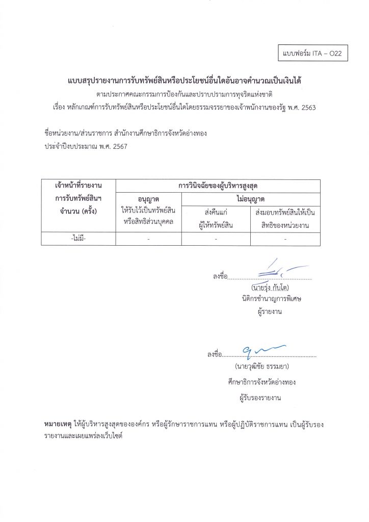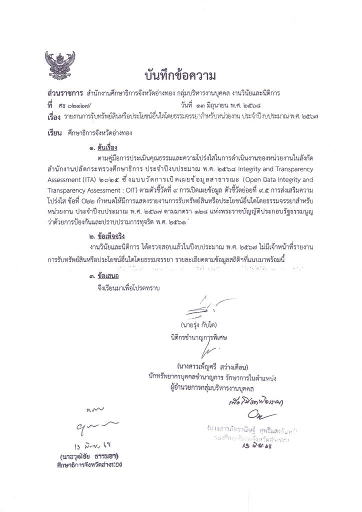 รายงานการรับทรัพย์สินหรือประโยชน์อื่นใดโดยธรรมจรรยา 23 พฤษภาคม 256827 มิถุนายน 2025 atg peo ITA 2568 atg peo