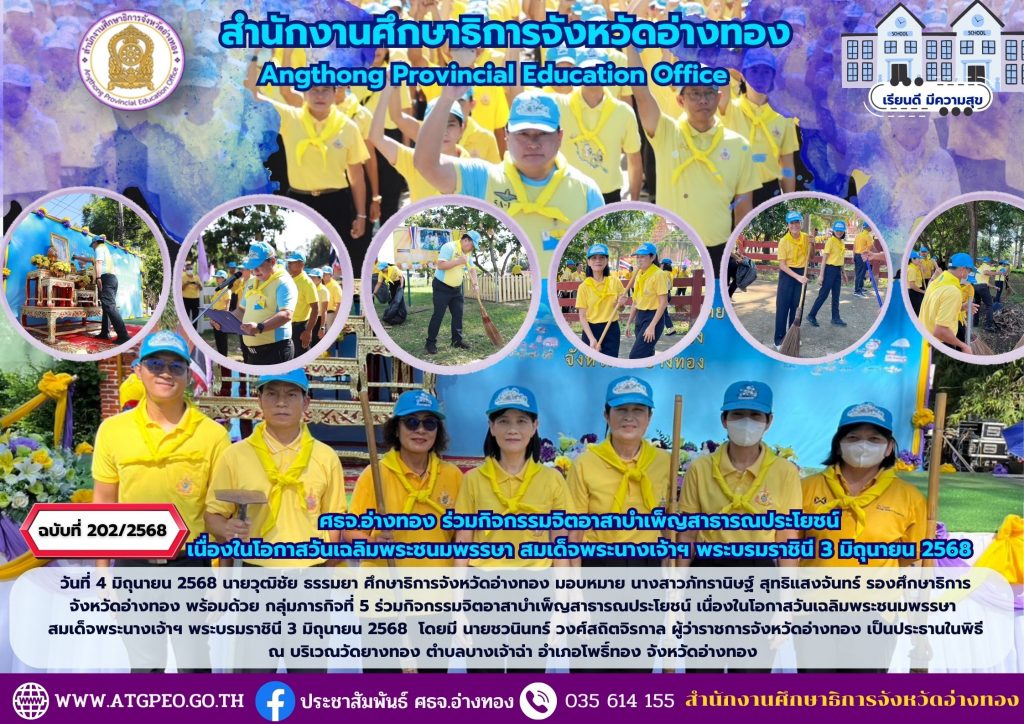วันที่ 4 มิถุนายน 2568 นายวุฒิชัย ธรรมยา ศึกษาธิการจังหวัดอ่างทอง มอบหมาย นางสาวภัทรานิษฐ์ สุทธิแสงจันทร์ รองศึกษาธิการจังหวัดอ่างทอง พร้อมด้วย กลุ่มภารกิจที่ 5 ร่วมกิจกรรมจิตอาสาบำเพ็ญสาธารณประโยชน์เนื่องในโอกาสวันเฉลิมพระชนมพรรษา สมเด็จพระนางเจ้าฯ พระบรมราชินี 3 มิถุนายน 2568 โดยมี นายชวนินทร์ วงศ์สถิตจิรกาล ผู้ว่าราชการจังหวัดอ่างทอง เป็นประธานในพิธี ณ บริเวณวัดยางทอง ตำบลบางเจ้าฉ่า อำเภอโพธิ์ทอง จังหวัดอ่างทอง