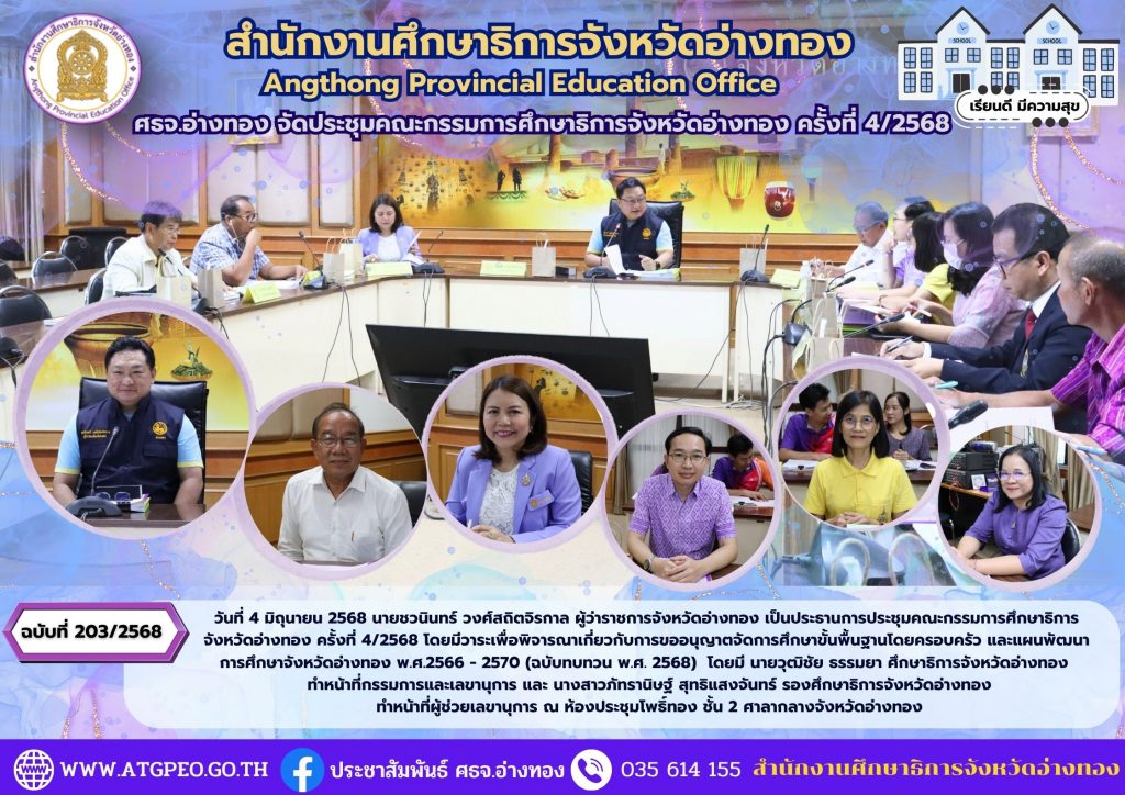 วันที่ 4 มิถุนายน 2568 นายชวนินทร์ วงศ์สถิตจิรกาล ผู้ว่าราชการจังหวัดอ่างทอง เป็นประธานการประชุมคณะกรรมการศึกษาธิการจังหวัดอ่างทอง ครั้งที่ 4/2568 โดยมีวาระเพื่อพิจารณาเกี่ยวกับการขออนุญาตจัดการศึกษาขั้นพื้นฐานโดยครอบครัว และแผนพัฒนา การศึกษาจังหวัดอ่างทอง พ.ศ.2566 – 2570 (ฉบับทบทวน พ.ศ. 2568) โดยมี นายวุฒิชัย ธรรมยา ศึกษาธิการจังหวัดอ่างทอง ทำหน้าที่กรรมการและเลขานุการ และ นางสาวภัทรานิษฐ์ สุทธิแสงจันทร์ รองศึกษาธิการจังหวัดอ่างทอง ทำหน้าที่ผู้ช่วยเลขานุการ ณ ห้องประชุมโพธิ์ทอง ชั้น 2 ศาลากลางจังหวัดอ่างทอง