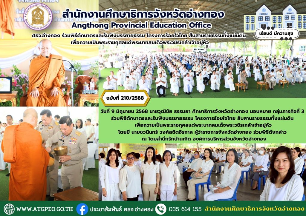 วันที่ 9 มิถุนายน 2568 นายวุฒิชัย ธรรมยา ศึกษาธิการจังหวัดอ่างทอง มอบหมาย กลุ่มภารกิจที่ 3 ร่วมพิธีตักบาตรและรับฟังบรรยายธรรม โครงการร้อยใจไทย สืบสานราชธรรมทั้งแผ่นดิน เพื่อถวายเป็นพระราชกุศลแด่พระบาทสมเด็จพระวชิรเกล้าเจ้าอยู่หัว โดยมี นายชวนินทร์ วงศ์สถิตจิรกาล ผู้ว่าราชการจังหวัดอ่างทอง ณ โดมสำนึกรักบ้านเกิด องค์การบริหารส่วนจังหวัดอ่างทอง