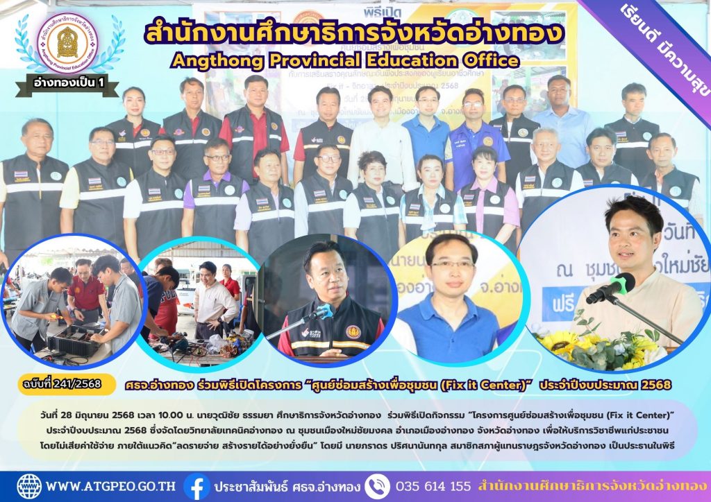 วันที่ 28 มิถุนายน 2568 เวลา 10.00 น. นายวุฒิชัย ธรรมยา ศึกษาธิการจังหวัดอ่างทอง ร่วมพิธีเปิดกิจกรรม “โครงการศูนย์ซ่อมสร้างเพื่อชุมชน (Fix it Center)” ประจำปีงบประมาณ 2568 ซึ่งจัดโดยวิทยาลัยเทคนิคอ่างทอง ณ ชุมชนเมืองใหม่ชัยมงคล อำเภอเมืองอ่างทอง จังหวัดอ่างทอง เพื่อให้บริการวิชาชีพแก่ประชาชน โดยไม่เสียค่าใช้จ่าย ภายใต้แนวคิด“ลดรายจ่าย สร้างรายได้อย่างยั่งยืน” โดยมี นายภราดร ปริศนานันทกุล สมาชิกสภาผู้แทนราษฎรจังหวัดอ่างทอง เป็นประธานในพิธี