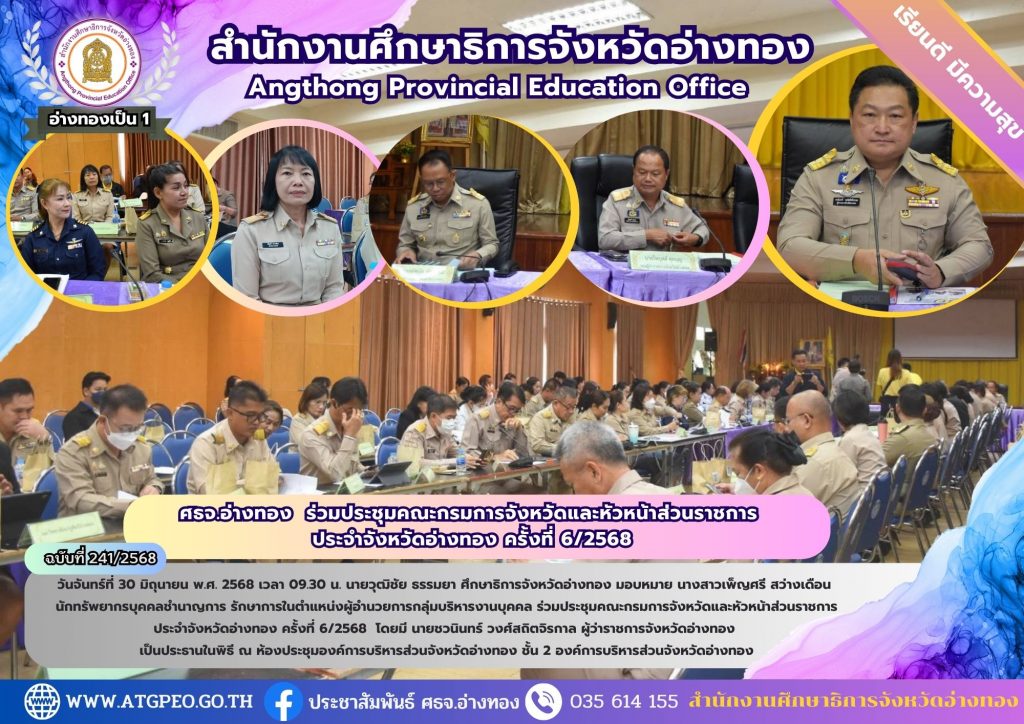 วันที่ 30 มิถุนายน พ.ศ. 2568 เวลา 09.30 น. นายวุฒิชัย ธรรมยา ศึกษาธิการจังหวัดอ่างทอง มอบหมาย นางสาวเพ็ญศรี สว่างเดือน นักทรัพยากรบุคคลชำนาญการ รักษาการในตำแหน่งผู้อำนวยการกลุ่มบริหารงานบุคคล ร่วมประชุมคณะกรมการจังหวัดและหัวหน้าส่วนราชการ ประจำจังหวัดอ่างทอง ครั้งที่ 6/2568 โดยมี นายชวนินทร์ วงศ์สถิตจิรกาล ผู้ว่าราชการจังหวัดอ่างทอง เป็นประธานในพิธี ณ ห้องประชุมองค์การบริหา ส่วนจังหวัดอ่างทอง ชั้น 2 องค์การบริหารส่วนจังหวัดอ่างทอง