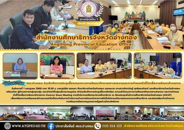 วันอังคารที่ 1 กรกฎาคม 2568 เวลา 10.30 น. นายวุฒิชัย ธรรมยา ศึกษาธิการจังหวัดอ่างทอง มอบหมาย นางสาวภัทรานิษฐ์ สุทธิแสงจันทร์ รองศึกษาธิการจังหวัดอ่างทอง พร้อมด้วย ผู้อำนวยการกลุ่มทุกกลุ่ม และเจ้าหน้าที่กลุ่มบริหารงานบุคคล เข้าร่วมรับฟังการประชุมชี้แจงซักซ้อม ความเข้าใจแนวทางการพัฒนาทักษะเฉพาะสายงาน และการกำหนด ตัวชี้วัดเพื่อการพัฒนาข้าราชการ ผ่านระบบ Zoom Meeting จากสำนักงานปลัดกระทรวงศึกษาธิการ ณ ห้องประชุมสำนักงานศึกษาธิการจังหวัดอ่างทอง (AKAP) เพื่อเตรียมความพร้อมและสร้างความเข้าใจที่ตรงกันในการดำเนินงานด้านการพัฒนาข้าราชการให้เป็นไปตามนโยบายของกระทรวงศึกษาธิการ และสอดคล้องกับเป้าหมาย การพัฒนาทรัพยากรบุคคลภาครัฐอย่างมีประสิทธิภาพ